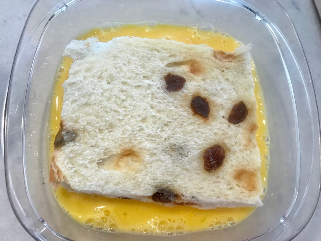 It is a sunny morning on my cheat day from workout, and I have RAISIN WHITE BREAD instead of WHOLE WHEAT bread in stock!! Perfect timing to finally try the air-fry French Toast recipe that I have long saved in my YouTube “watch later” playlist. Honestly, who does not like the deep fried French Toast, especially the Hong Kong style with rich amount of peanut butter, condensed milk, honey running across, and a giant chunk of salted butter that is so heavy that is crushes and leaves a dent on the fluffy toast?