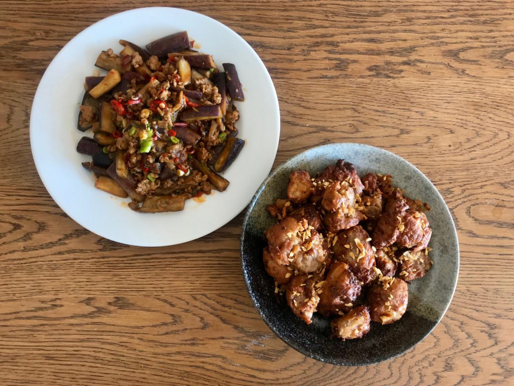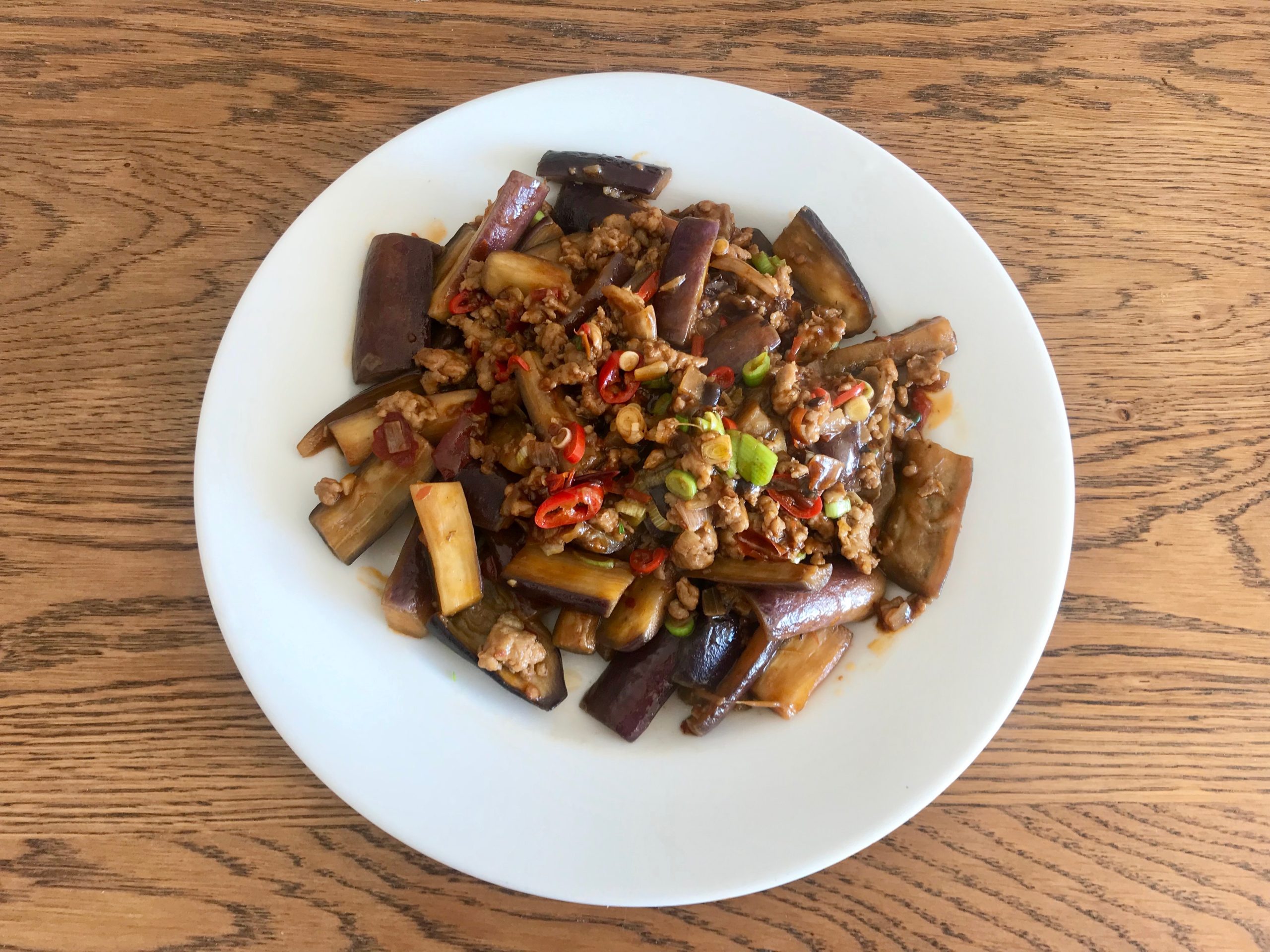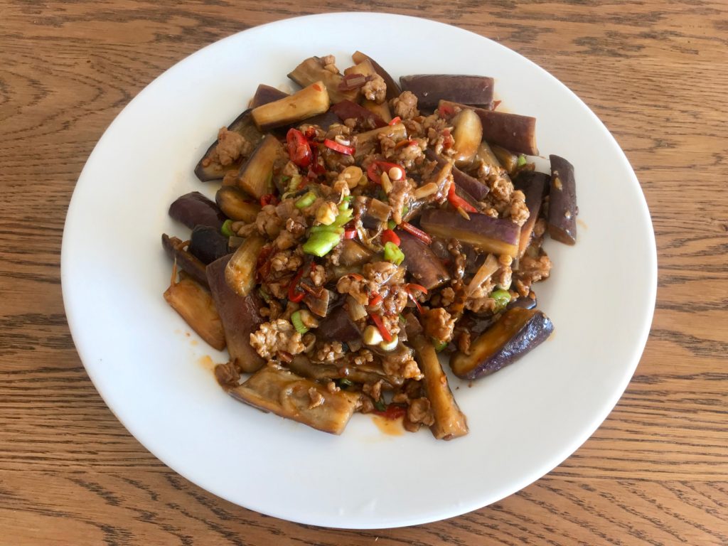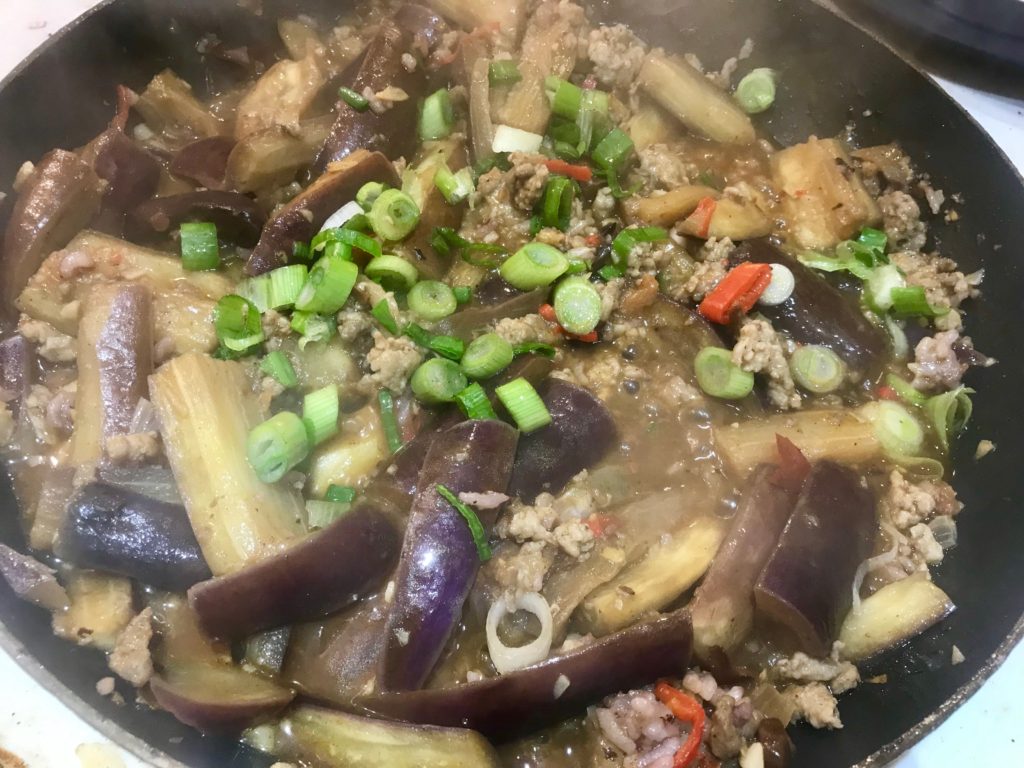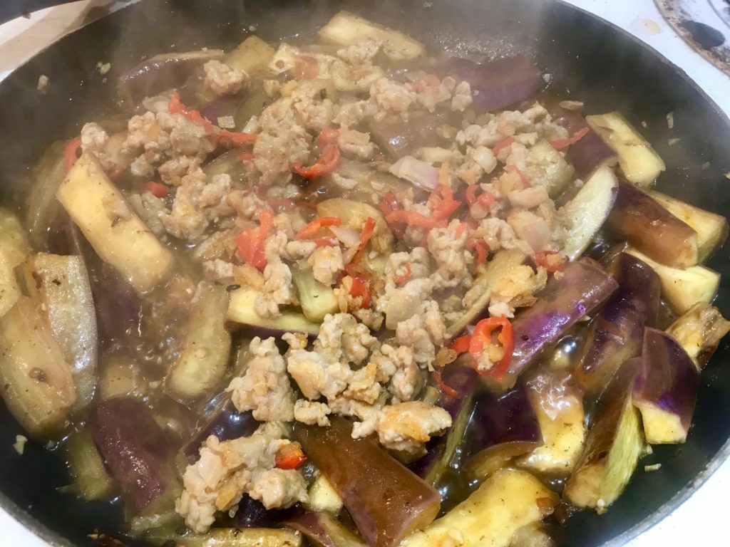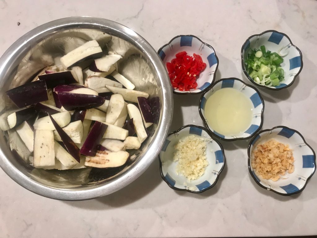 Having Cantonese trick: the use of dried shrimp to give the “fish” taste; stir fry eggplants