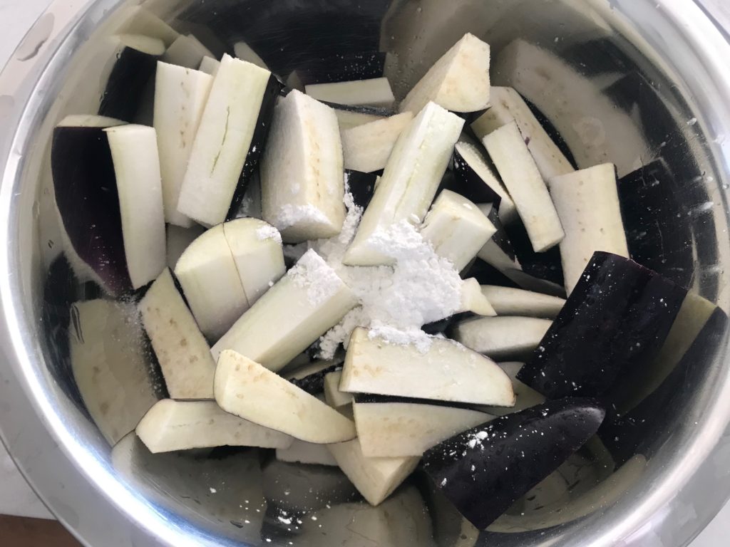 Step 2: slice 3 egg plants into thin slices (shorter cooking time), mix well with 1tsp salt, 1tbsp rice vinegar (not the dark vinegar because we want to preserve color) and 1tbsp corn starch. This step helps squeeze out excessive water from eggplants, at the same time preserve color and nutrients.
