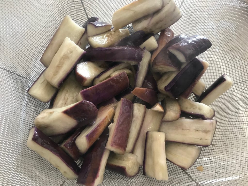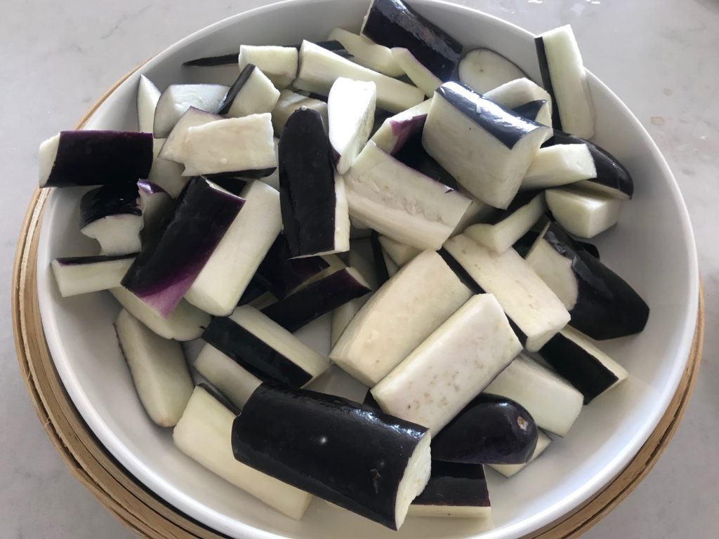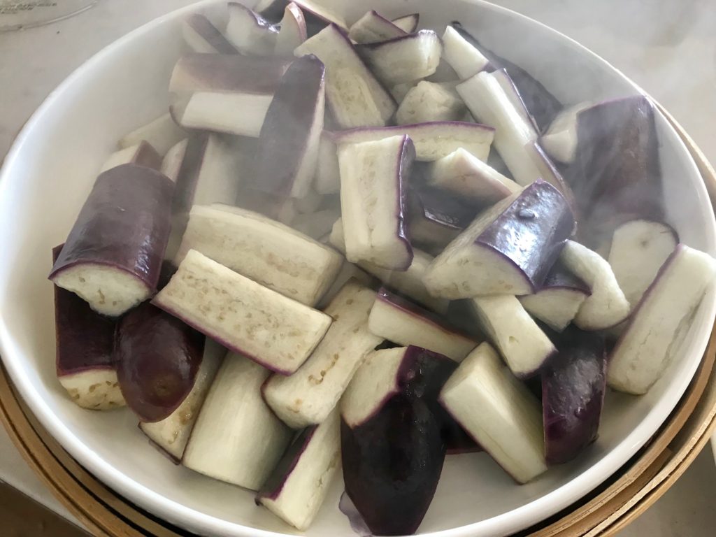 Step 6: to pre-cook egg plants, there are various ways: steaming at medium heat for 15mins, deep-frying, stir-frying directly. I have tried both steaming and stir-frying, I do not think there is a big difference in texture, but more convenience.