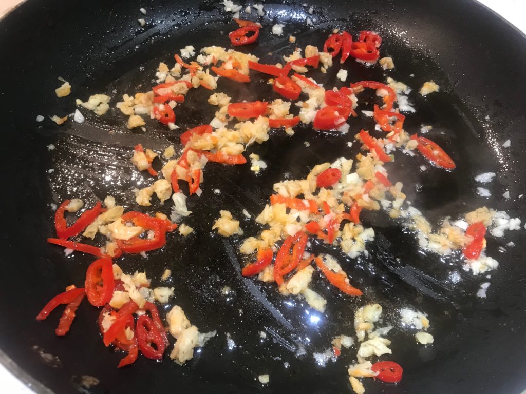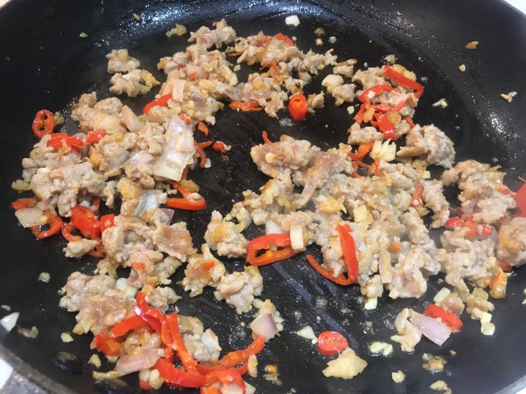 Step 5: over medium-high heat, add oil in pan, add 1/2 minced garlic, minced ginger and 1/2 minced chili pepper and stir fry for around 30secs; when fragrance comes out, add in chopped dried shrimps and stir fry for another 30secs. Then turn up heat, add seasoned ground pork and stir fry for 1-2mins. Remove everything from pan.