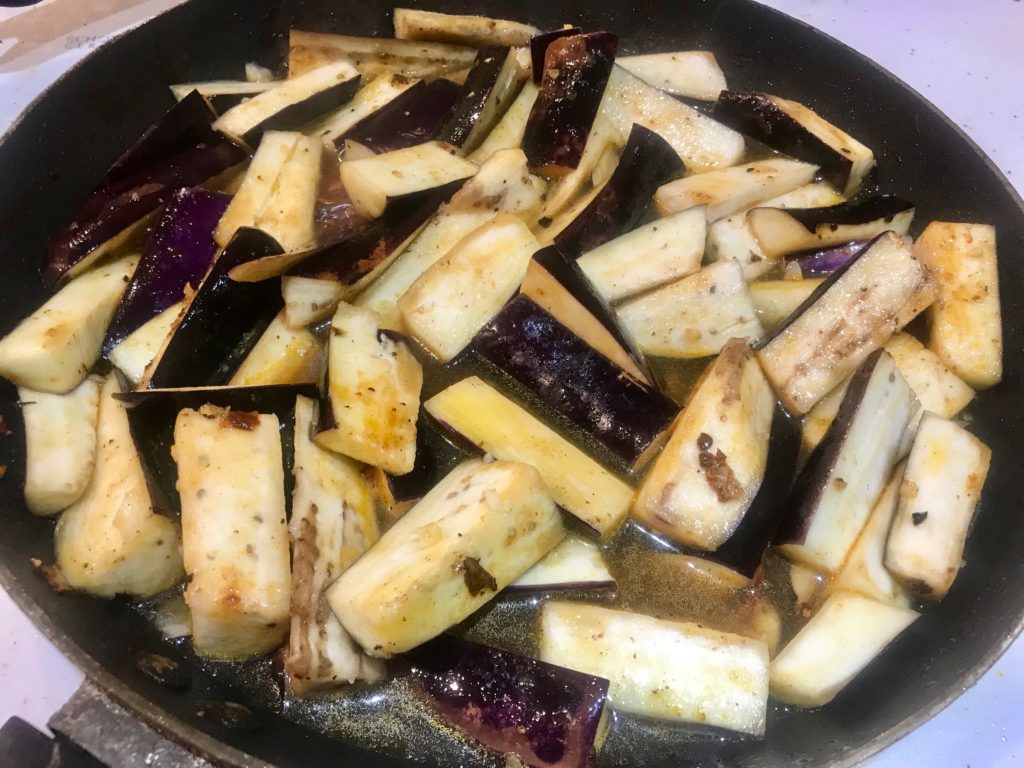• precooking eggplants, either steaming or stir-frying does not vary much in texture, maybe more concern of convenience