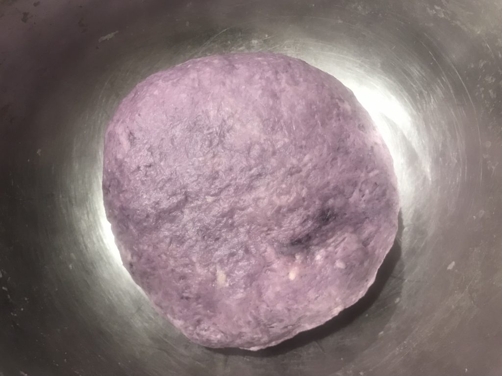 Step 3: mix 1g ube extract, 250g AP flour, 70g milk, 20g soft butter, 24g sugar and 6g salt, yeast water. Form dough.