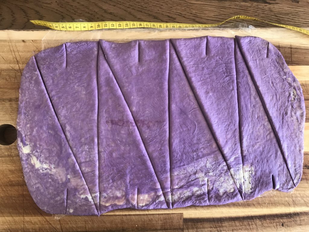 Step 3: put croissant dough sheet back in fridge for 15-30mins. All the rolling before might warm up croissant dough especially in summer, making croissant dough sticky and “skin” break.