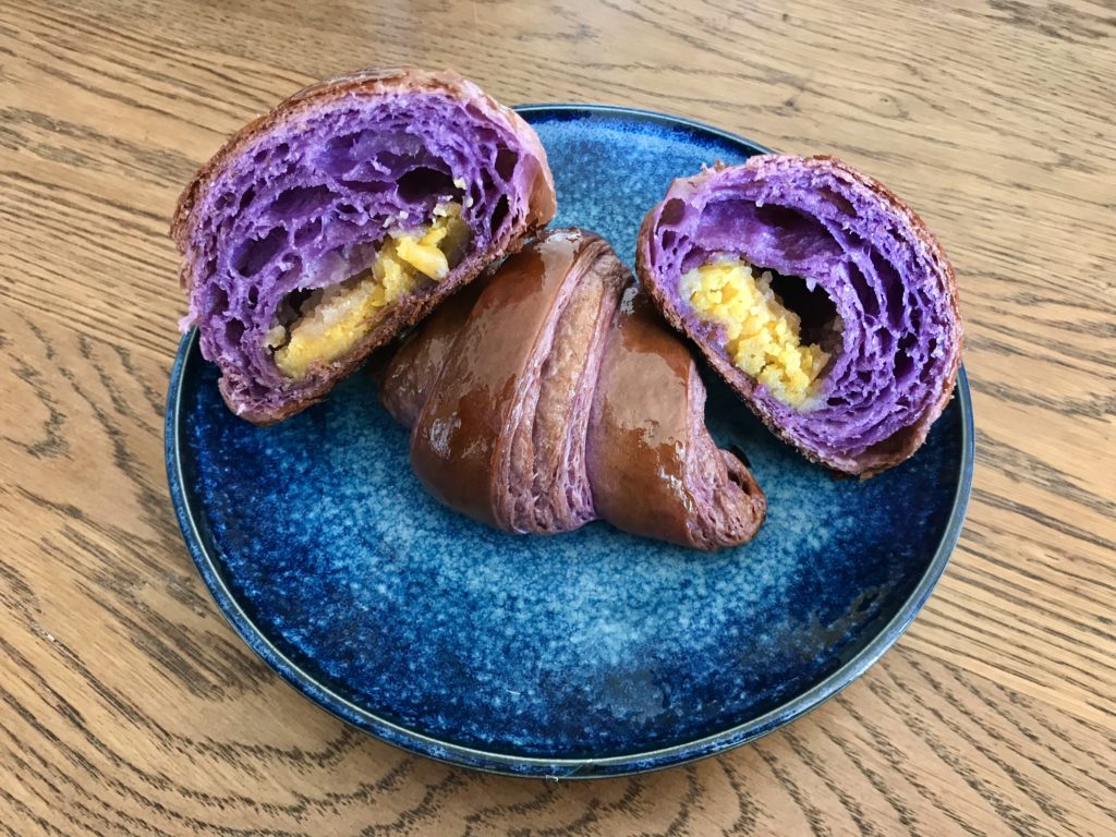 Today (02/12/2021) is the Lunar New Year. 2021 is the year of Ox, Happy “Niu” Year! “Niu” is the pronunciation of ox in mandarin, in Chinese, croissants are also called Niu Jiao Bao, Ox Horn Bread because the shape of croissants. To celebrate the Lunar New Year, I adopted croissants to a more Asian flavor with my favorite Cantonese steam bun – lava bun with salted egg yolk 流沙包, and taro fillings.