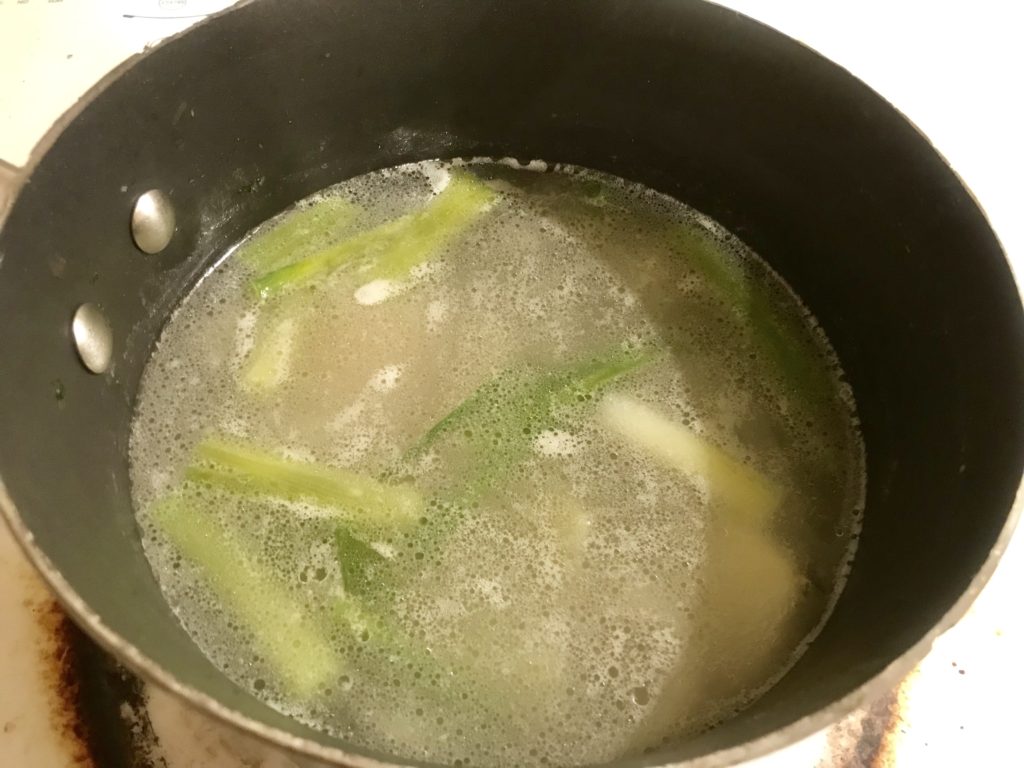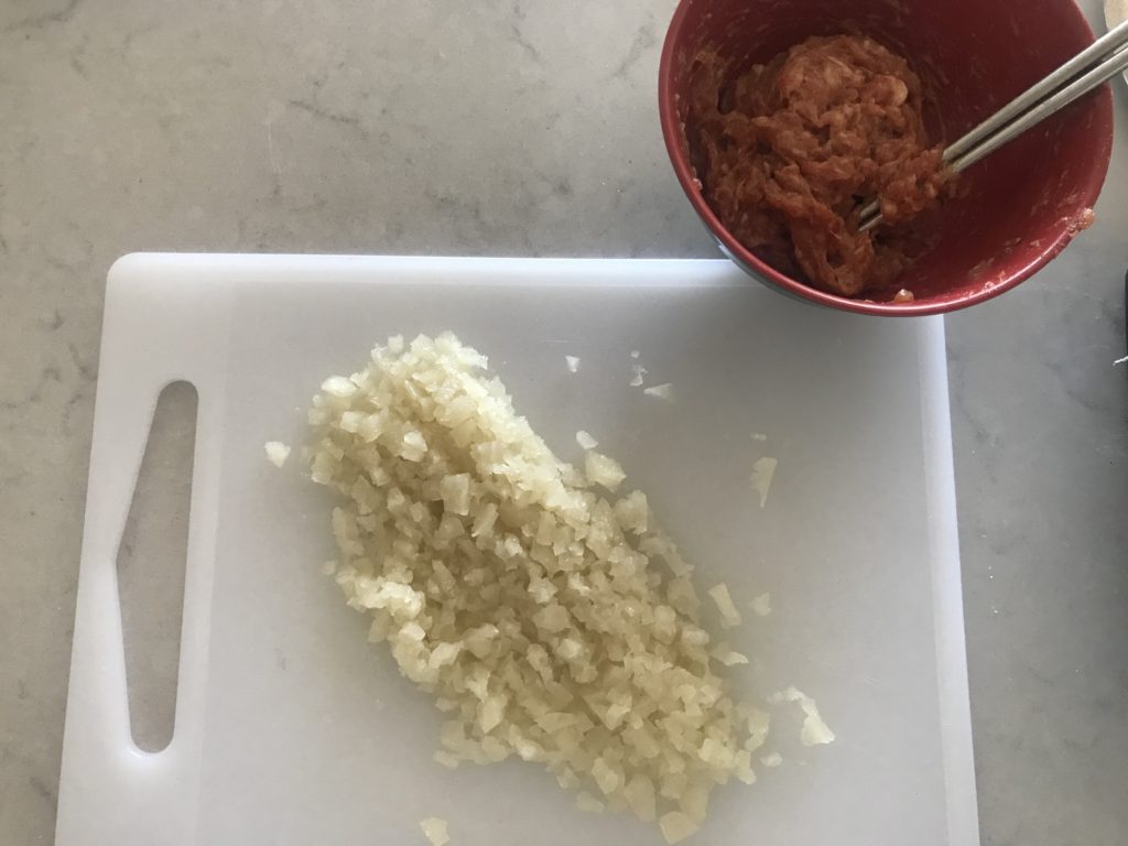 - Step 1: in a cup/bowl of water, put in scallion and ginger slices to flavor the water, will be mixed in meat fillings to tenderize later; if too much work, can just use water and skip this step.