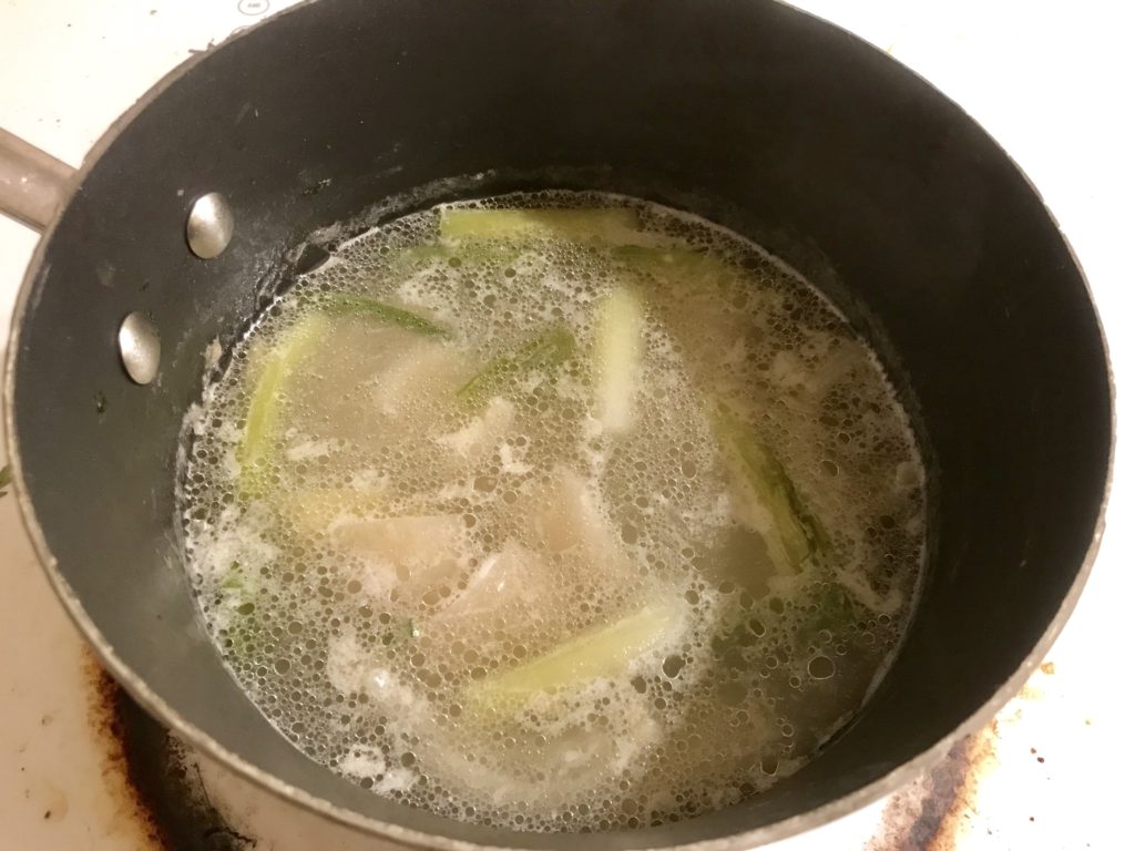 - Step 3: boil 1500g water again, then put in pork skin, scallion chunks, ginger slices; bring to boil, then turn down heat till you see small bubbles rising up but with a “calm” water surface. Cook for 2 hours, withOUT lid.