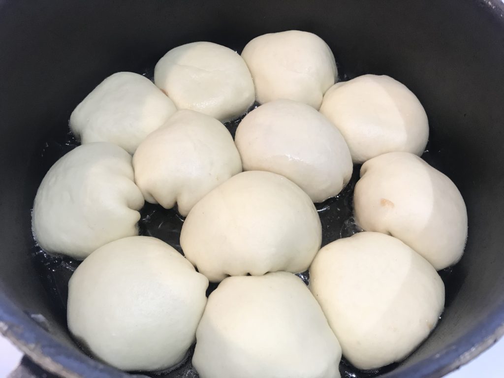 - Step 7: in a pan/low edge pot, pour oil, enough to cover surface and a bit more. After we put buns all in, the oil should be slightly higher than the bottom of buns.