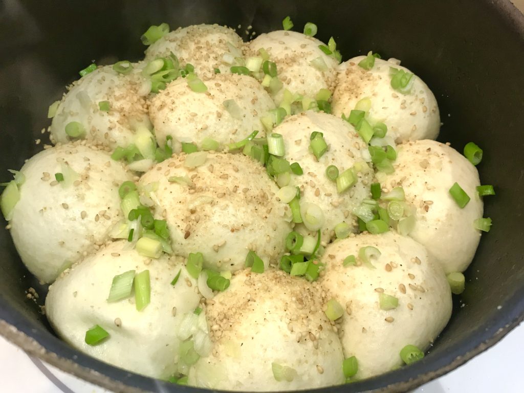 Shanghai is not just famous for soup dumplings 灌湯包, it is also famous for its Shengjian Mantou 生煎饅頭/生煎包, which has a dough texture in between a soft steam bun and a chewy, thin soup dumpling. The top part (above oil) of Shengjian Mantou is soft, and half-risen with yeast and under high temperature as water evaporates in hot, lid-on pot; on the contrary, the bottom of Shengjian Mantou sticks closely to the pan/pot and the hot oil sizzles, fries it and gives it a golden-brown, crispy texture. The combination of soft top and crispy bottom, the drier bun dough and soupy fillings, will give you a new insight into Shanghainese delicacy!