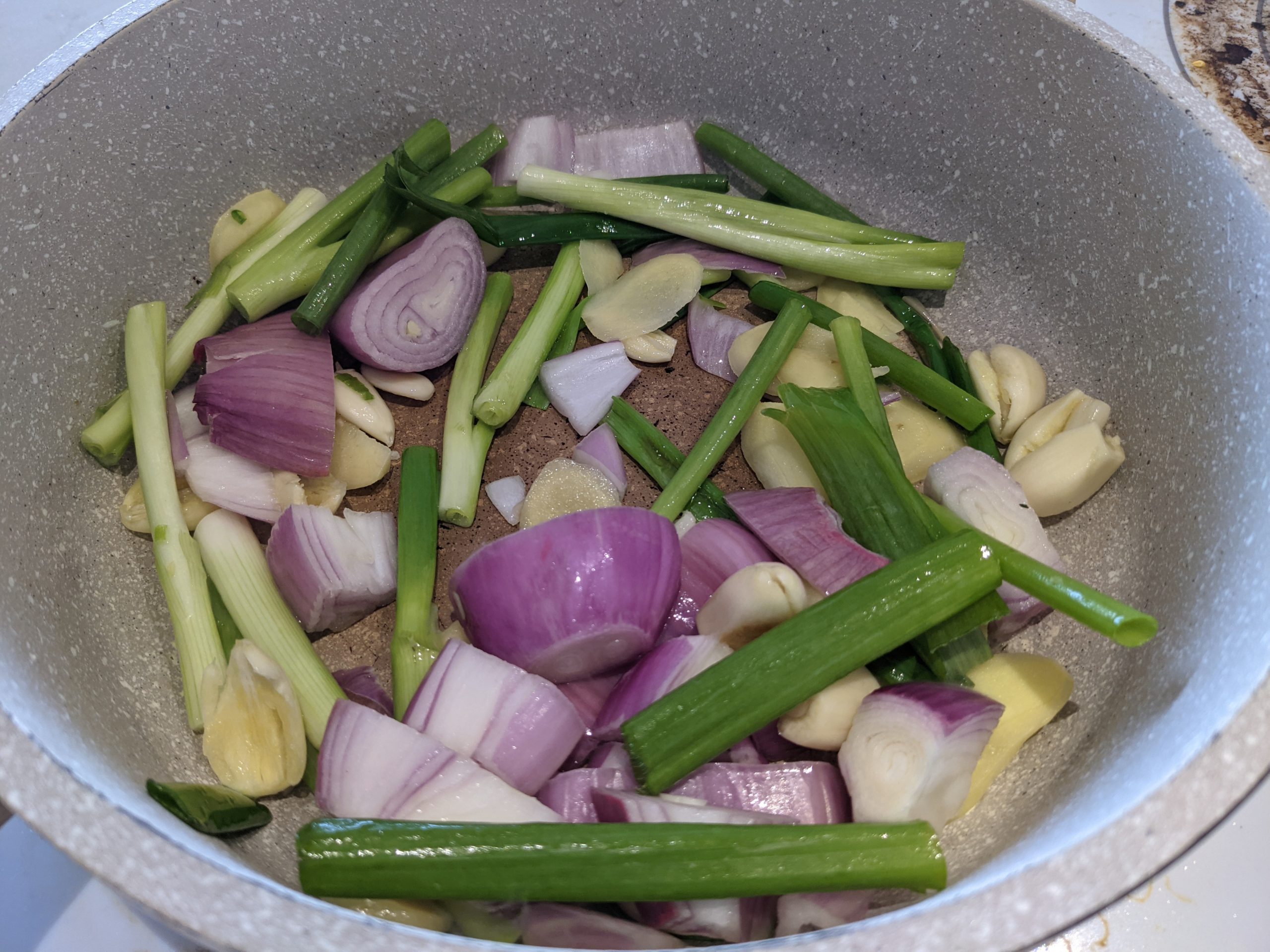 Step 4: in a pan, add oil; after oil gets hot, add in scallion chunks, shallot chunks, ginger slices and garlic cloves, stir fry till fragrance appears.
