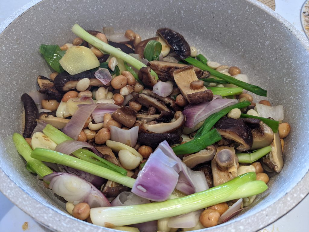 Step 0: put dry shiitake mushroom in water, 20-25g hair veggies in water and peanuts in water; remove peanut skin if needed (personal preference); KEEP THE WATER for later use.