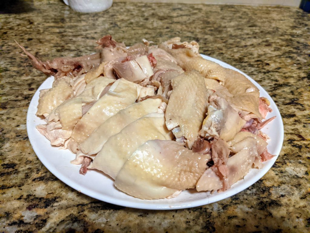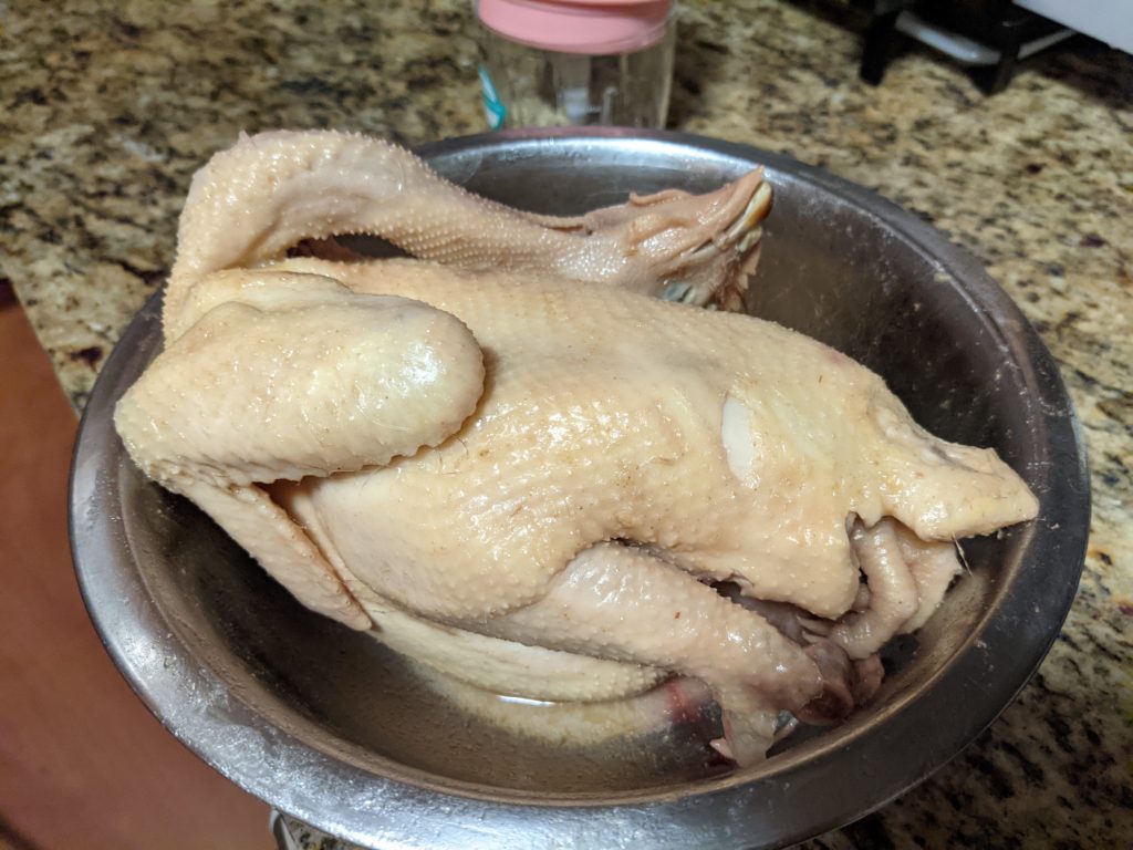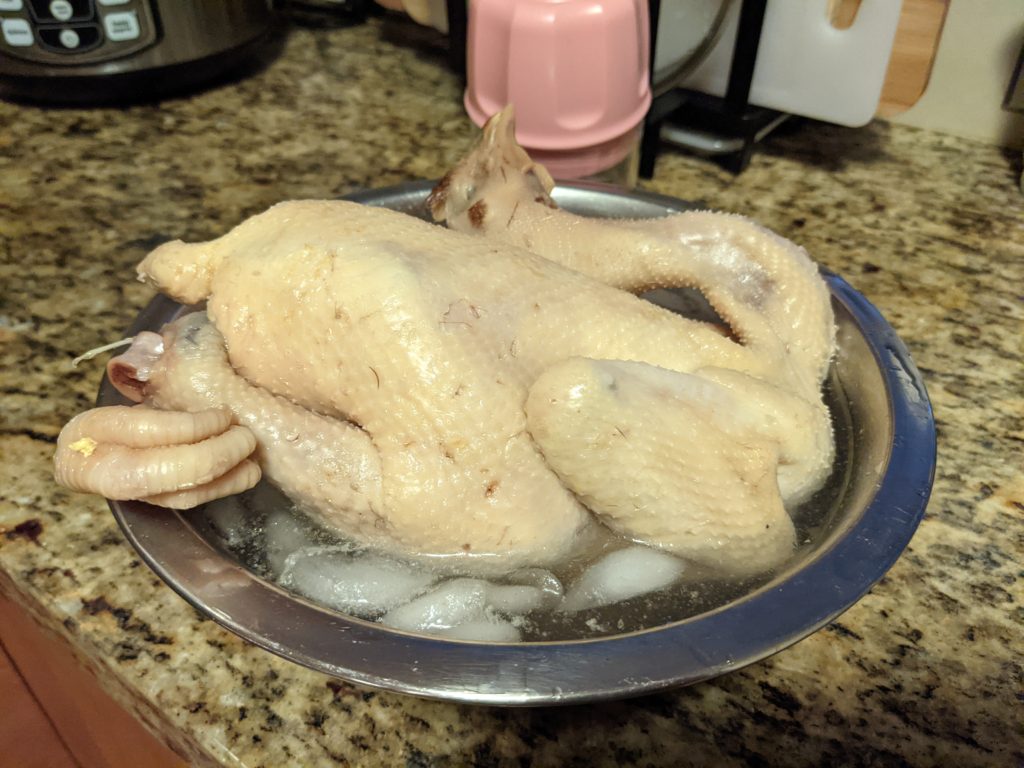 Remove chicken from pot and dip in ice water for 3-5 mins, ensuring the skin is bouncy instead of super soft.