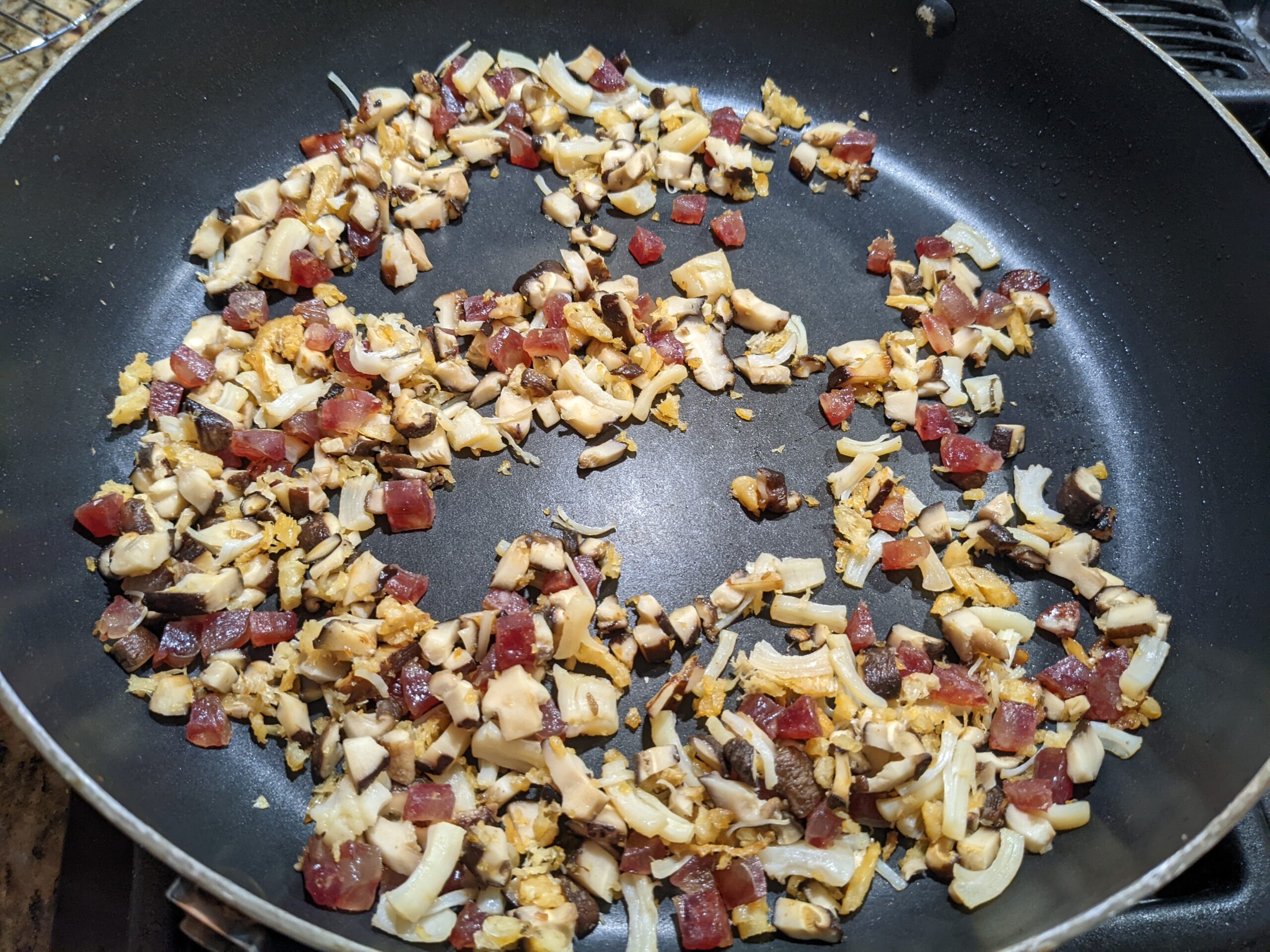 STEP 4: low to medium temperature, in a pan stir fried Cantonese sausage, bacon cubes till oil comes out, then add in mushroom, lastly dried shrimp and scallop (the order how I added them in below is not correct, Cantonese sausage / bacon should be added first because they are most fatty). Transfer all to plate.
