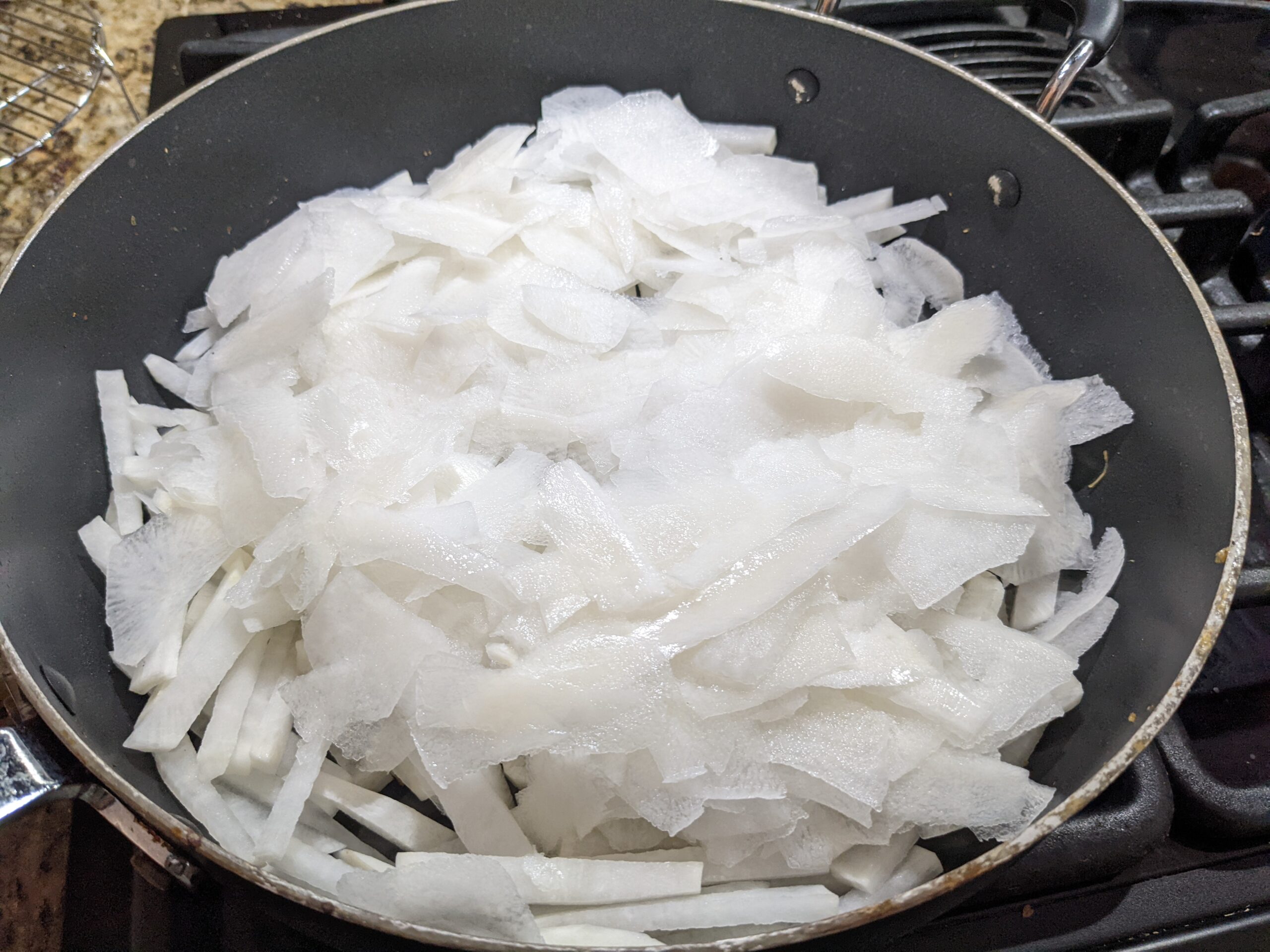 STEP 5: over medium heat, add in think chunks then thin slices of radish in pan, cover with lid and cook for ~10mins till radish water comes out, or turning transparent