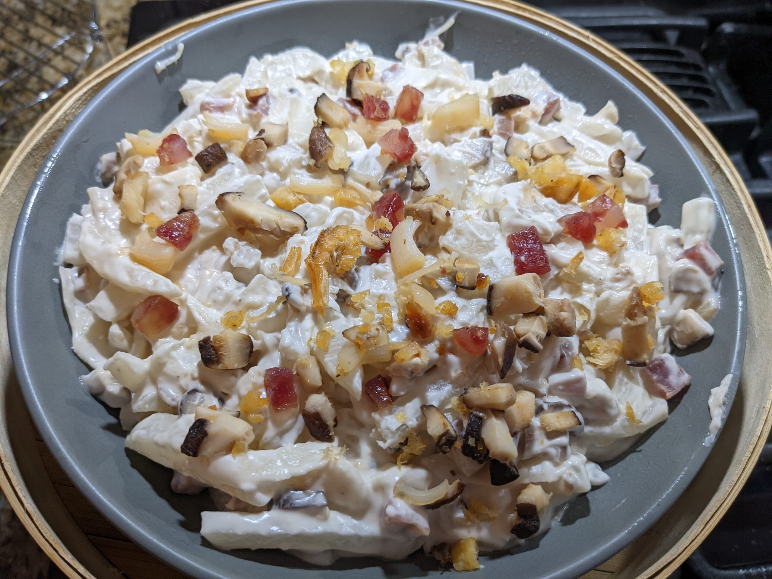 STEP 8: brush steaming containing or deeper dish with oil, then transfer turnip cake mixture in container, press down; drizzle the top of turnip cake mixture with leftover dried scallop/shrimp/mushroom/sausage/bacon mixture. Steam for 10-15mins or till no turnip cake left on a chopstick/toothpick poked in.