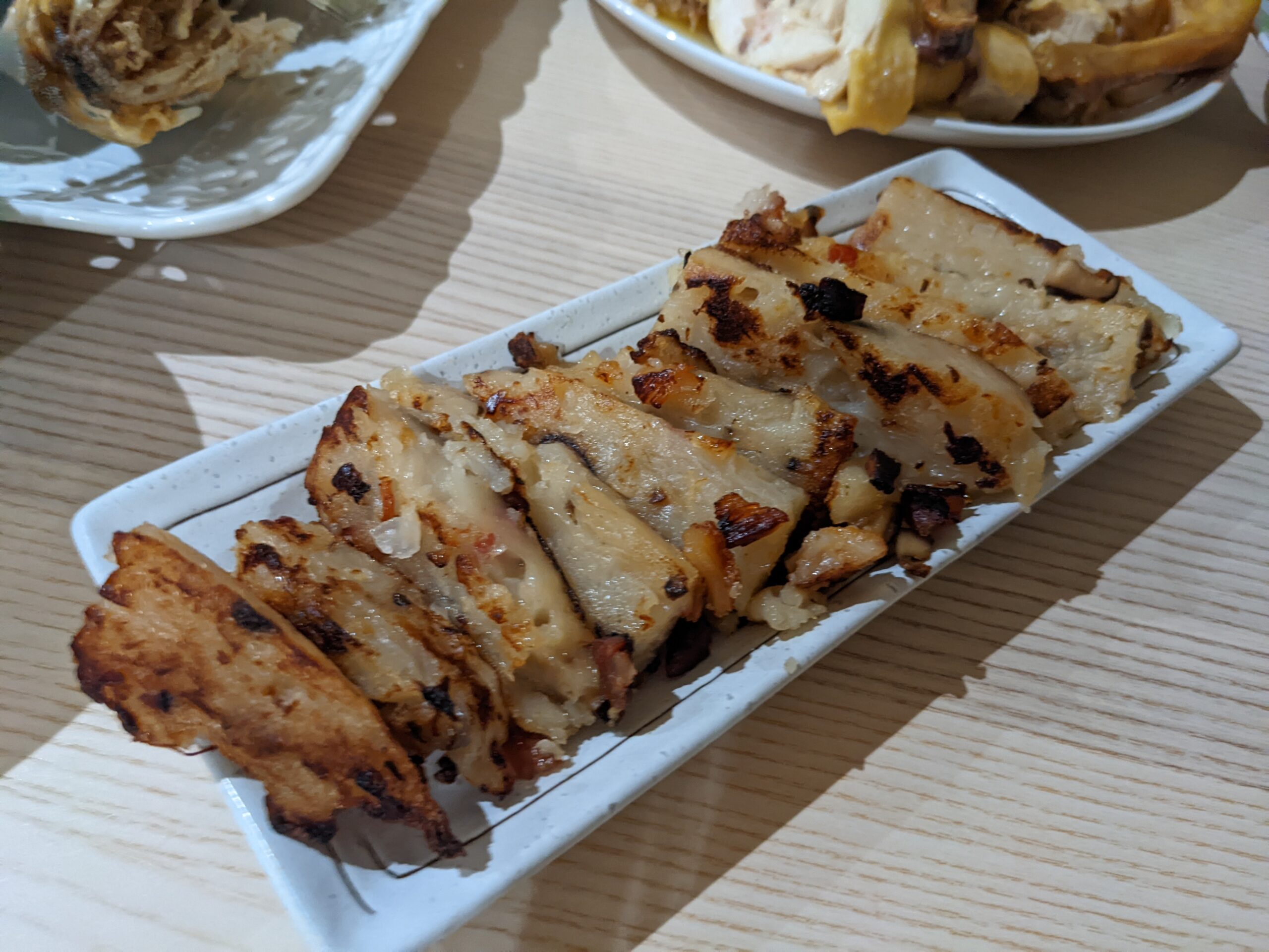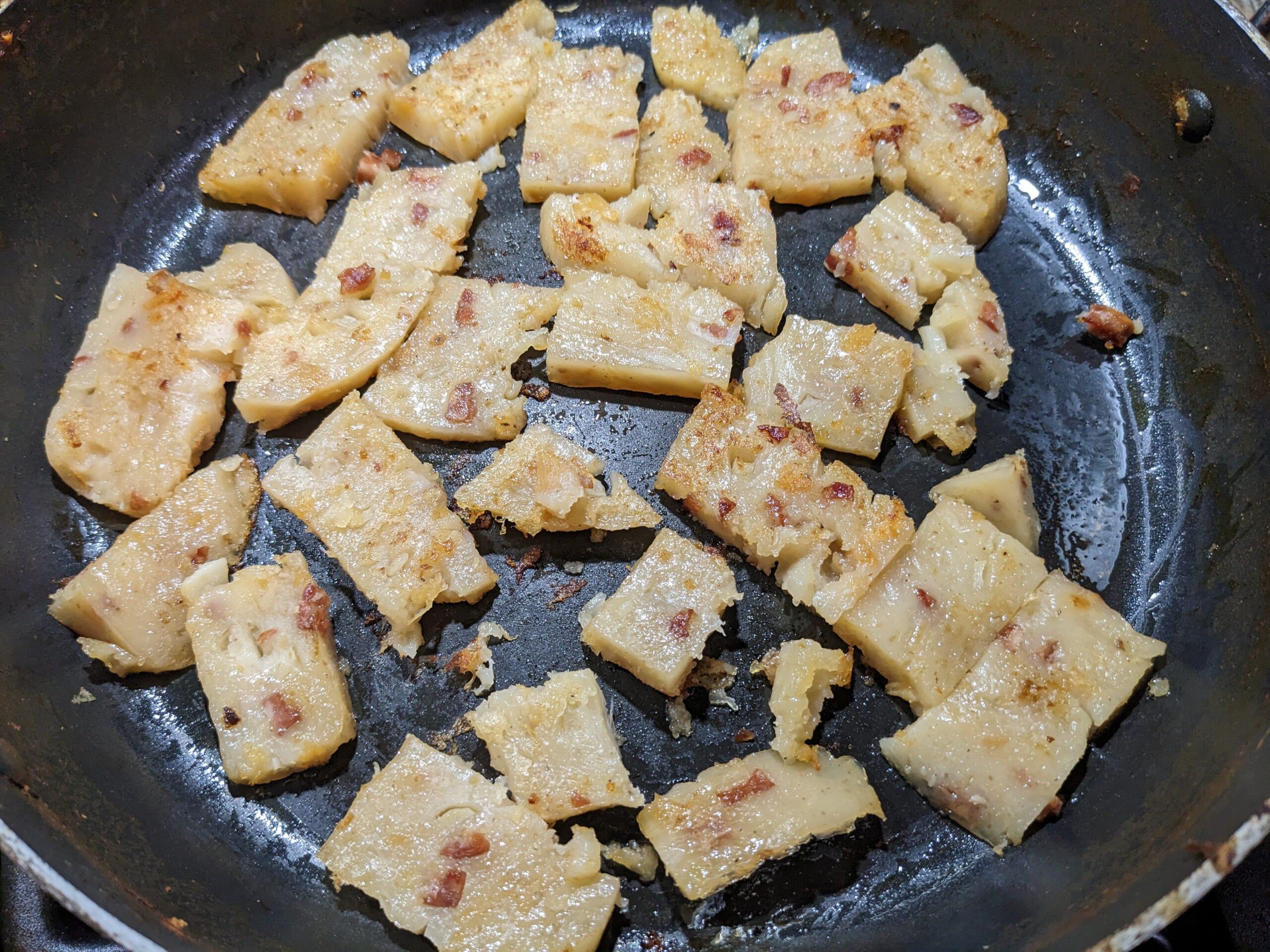 • when pan-frying the radish cake, do not flip too often. Pan fry one side till golden crispy then flip to the other side.