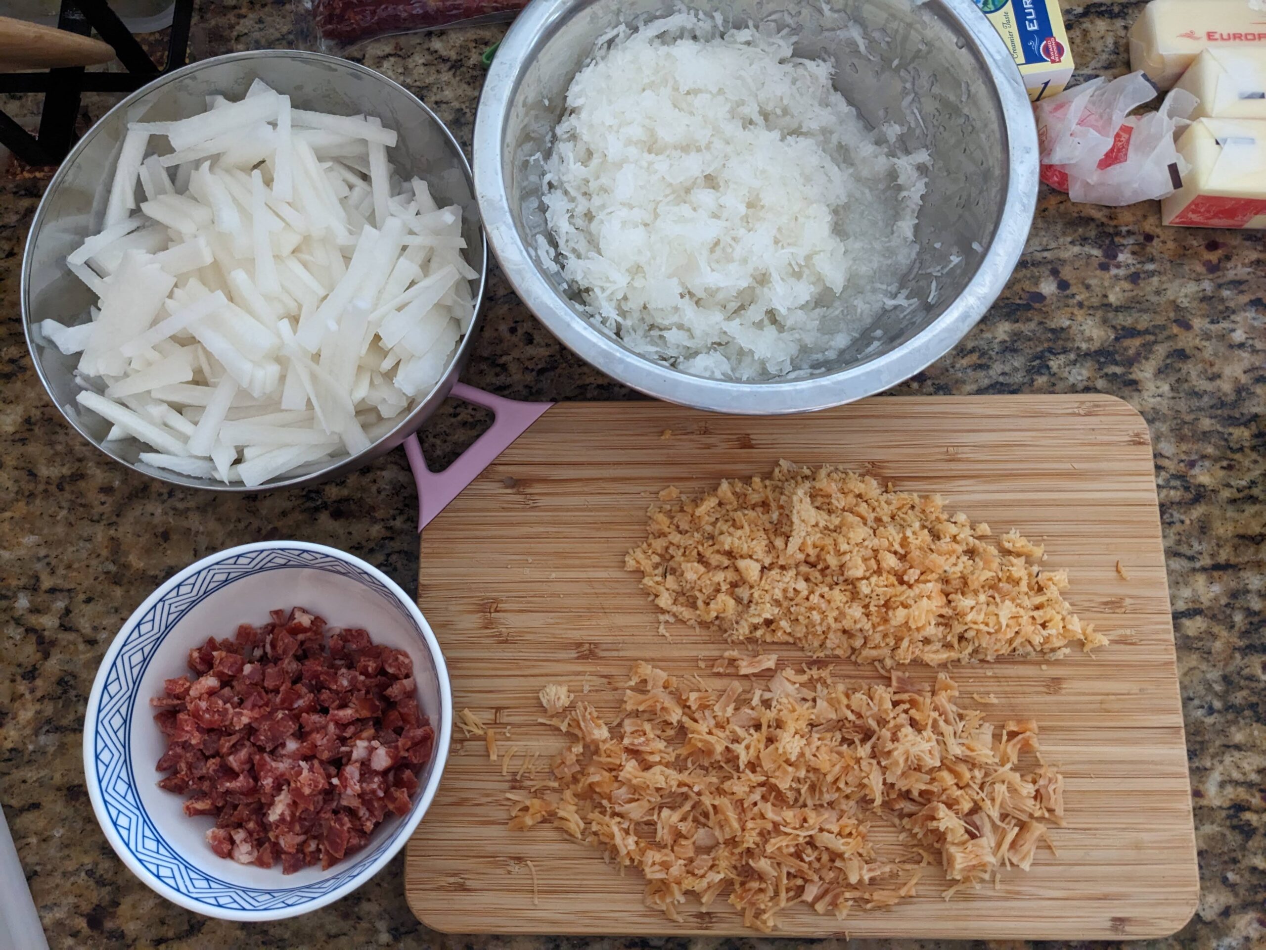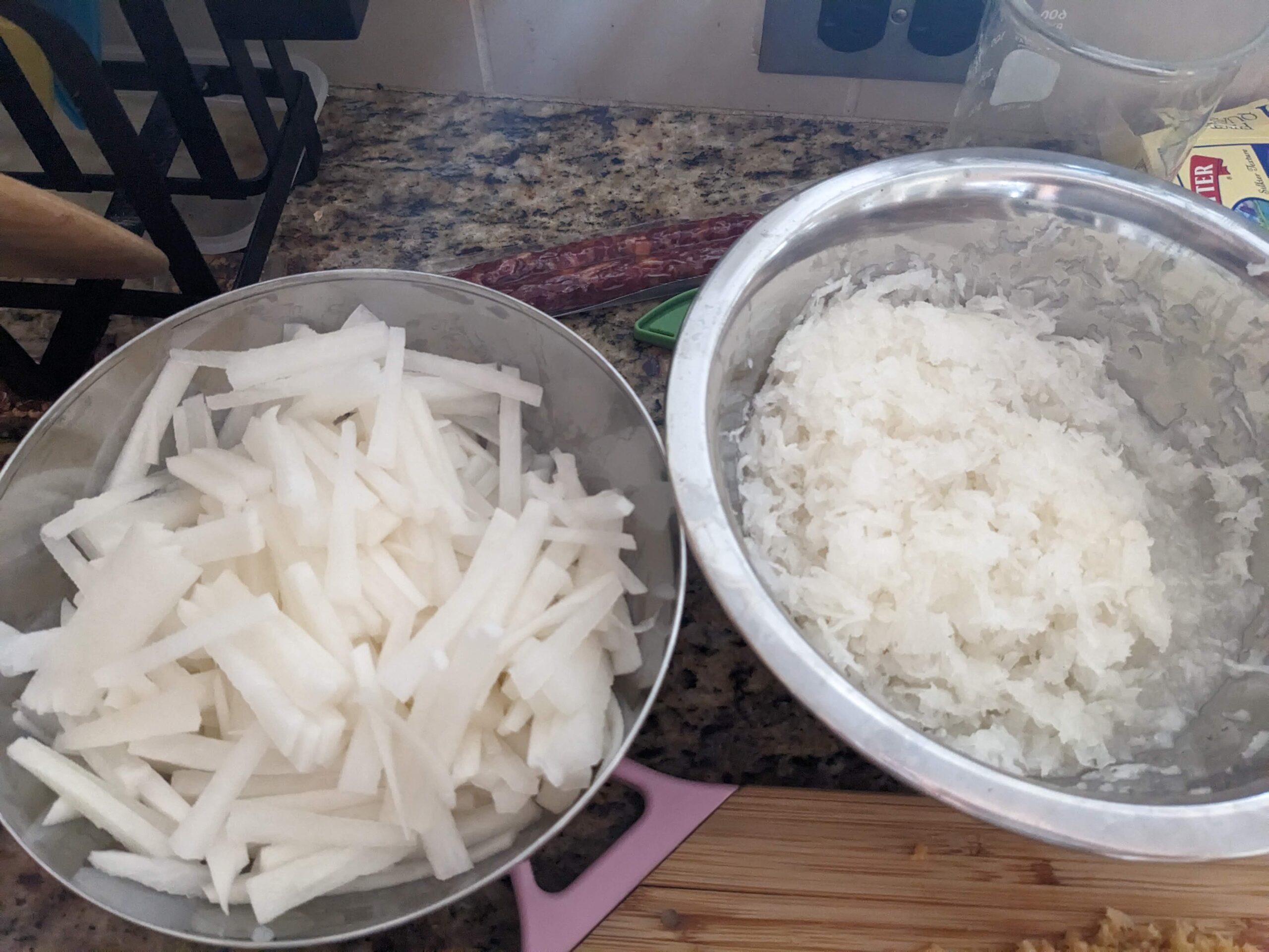 • if the flour mixture is too watery, the radish cake might be on the softer end, and more fragile; if the mixture is stickier/heavier, the radish cake would be tighter, more solid. Either texture works, depends on personal preference.