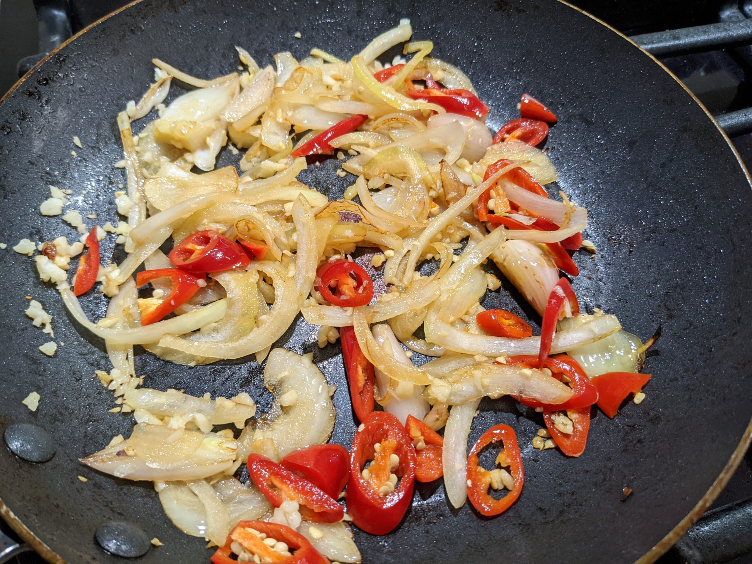 STEP 6: remove pork belly from pan, add in onion/shallot slices, pan fry till golden, caramelized, then add in jalapeno slices