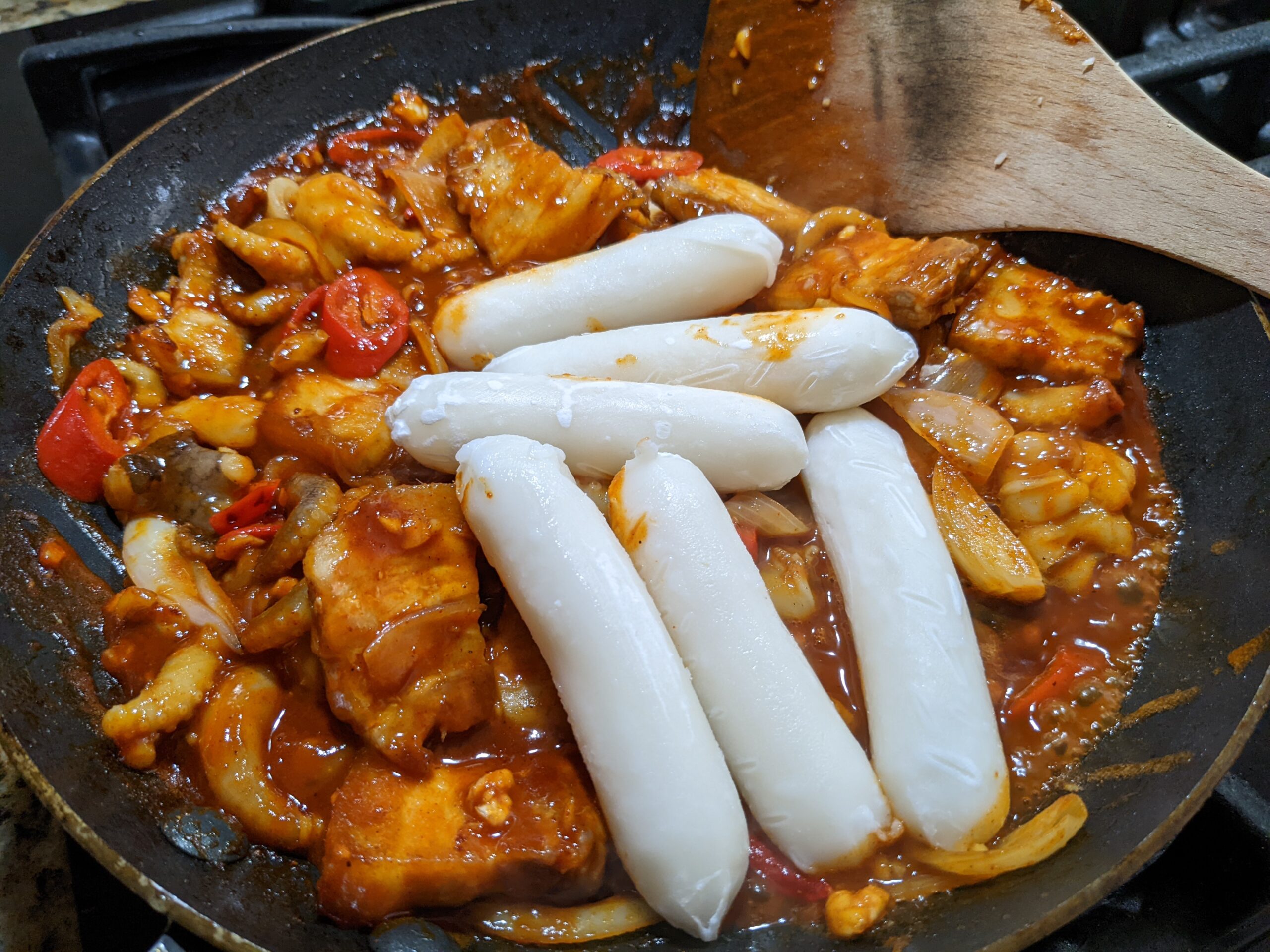 STEP 7: add in marinated octopus, pork belly and rice cake, stir fry over medium heat. Add in a few tbsp of water (can use water to rinse off from marinated bowl then add in pan) to prevent dish from drying out; cook over medium – low heat for 5-8mins so rice cake is also cooked at perfect chewy texture.