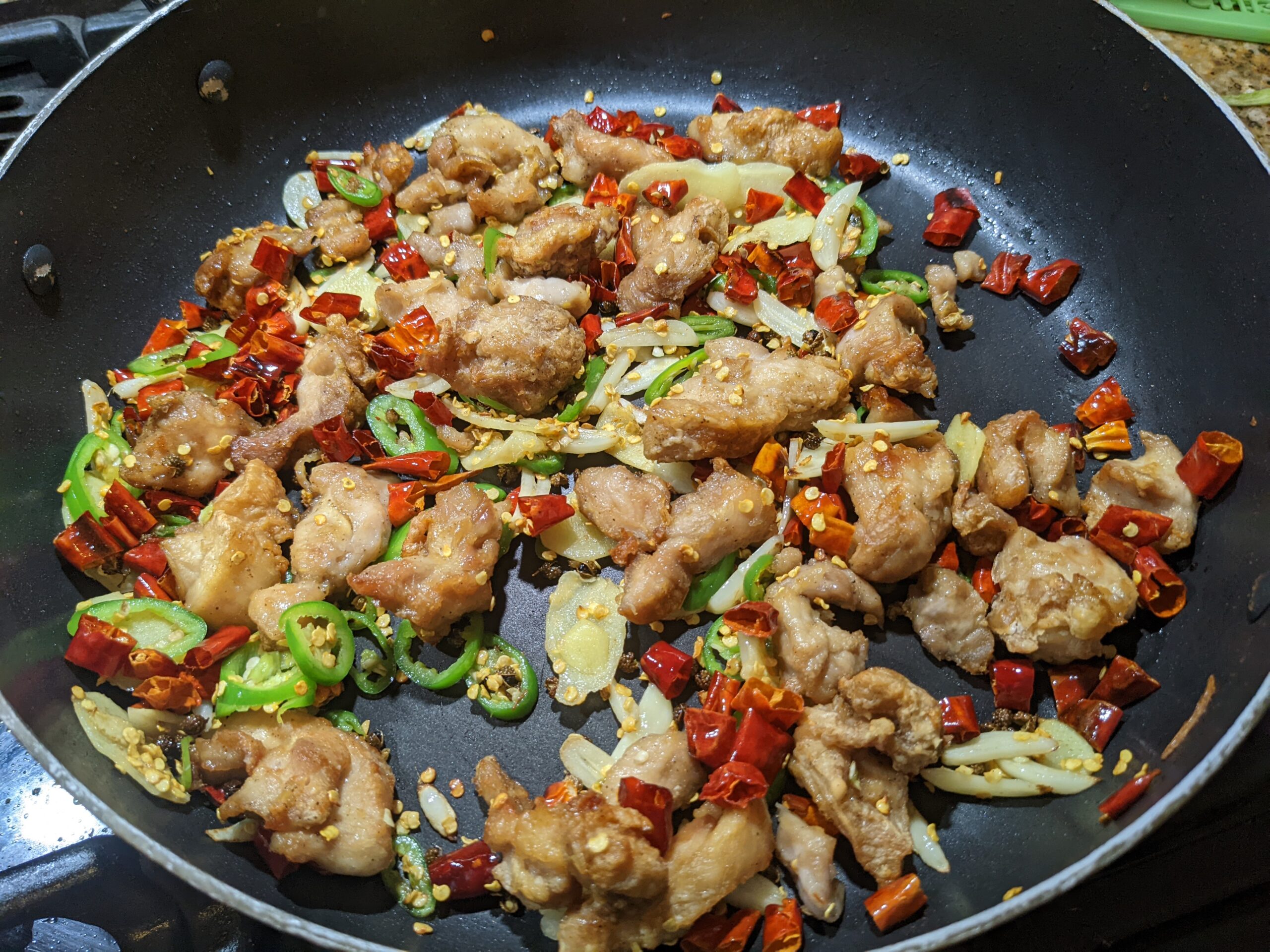 STEP 5: add dried chili peppers, Szechuan peppercorn in the pan, stir fry till fragrance comes out. If chicken is not ready, turn off heat; if chicken is ready, add chicken in