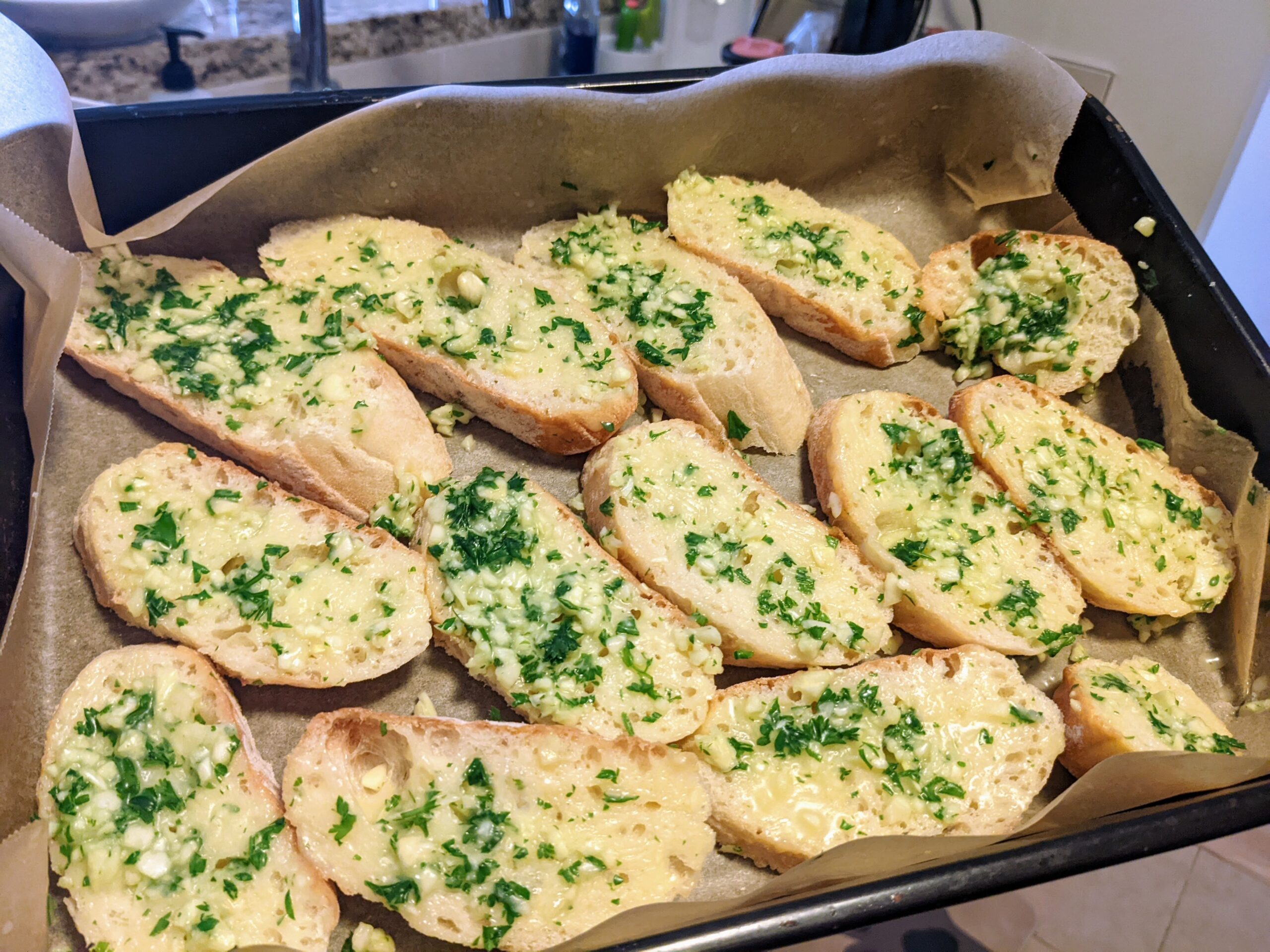 - need to bake baguette at a higher temperature for a longer time if using oven instead of air-fryer, otherwise the garlic tastes and smells raw..