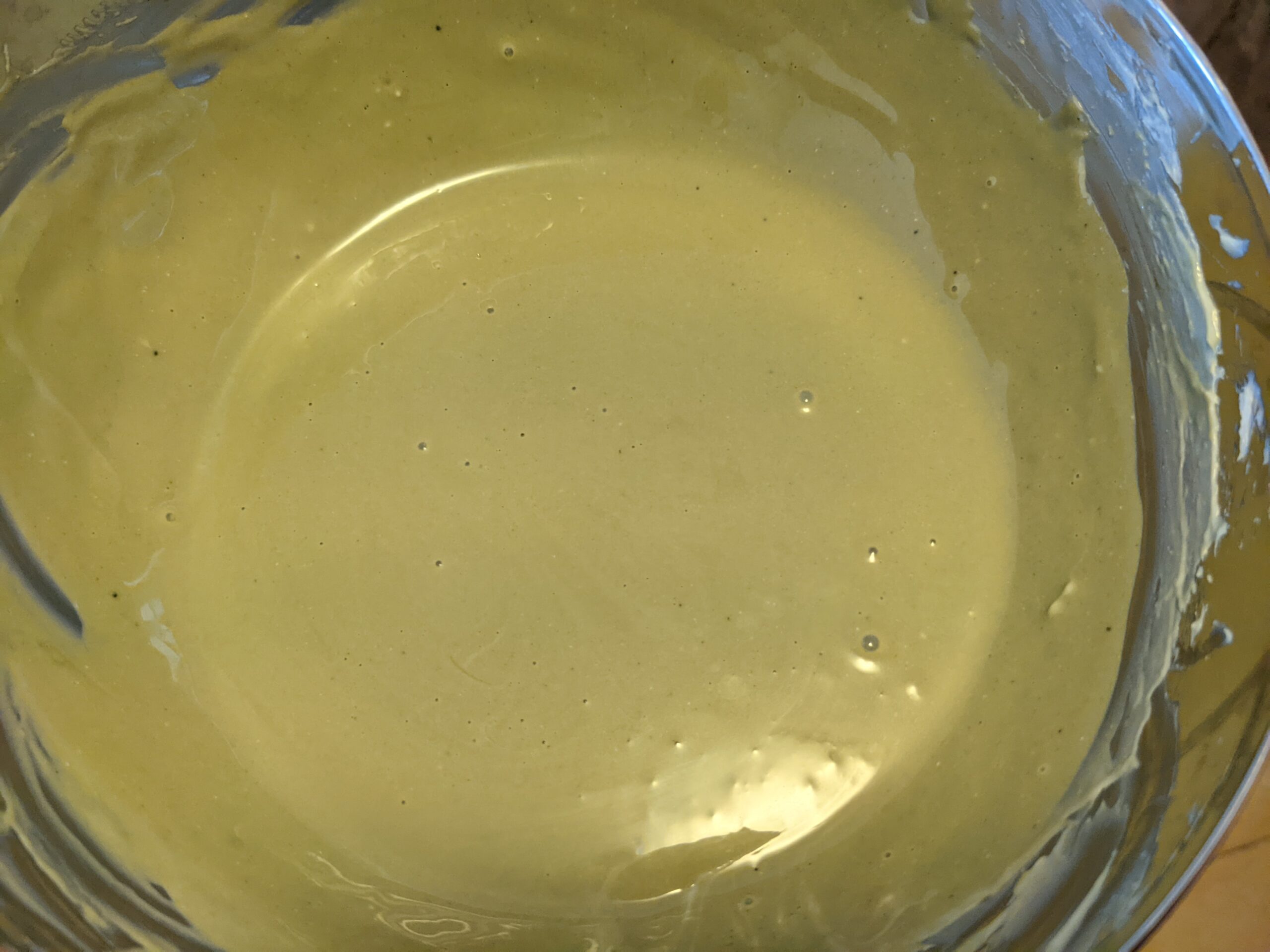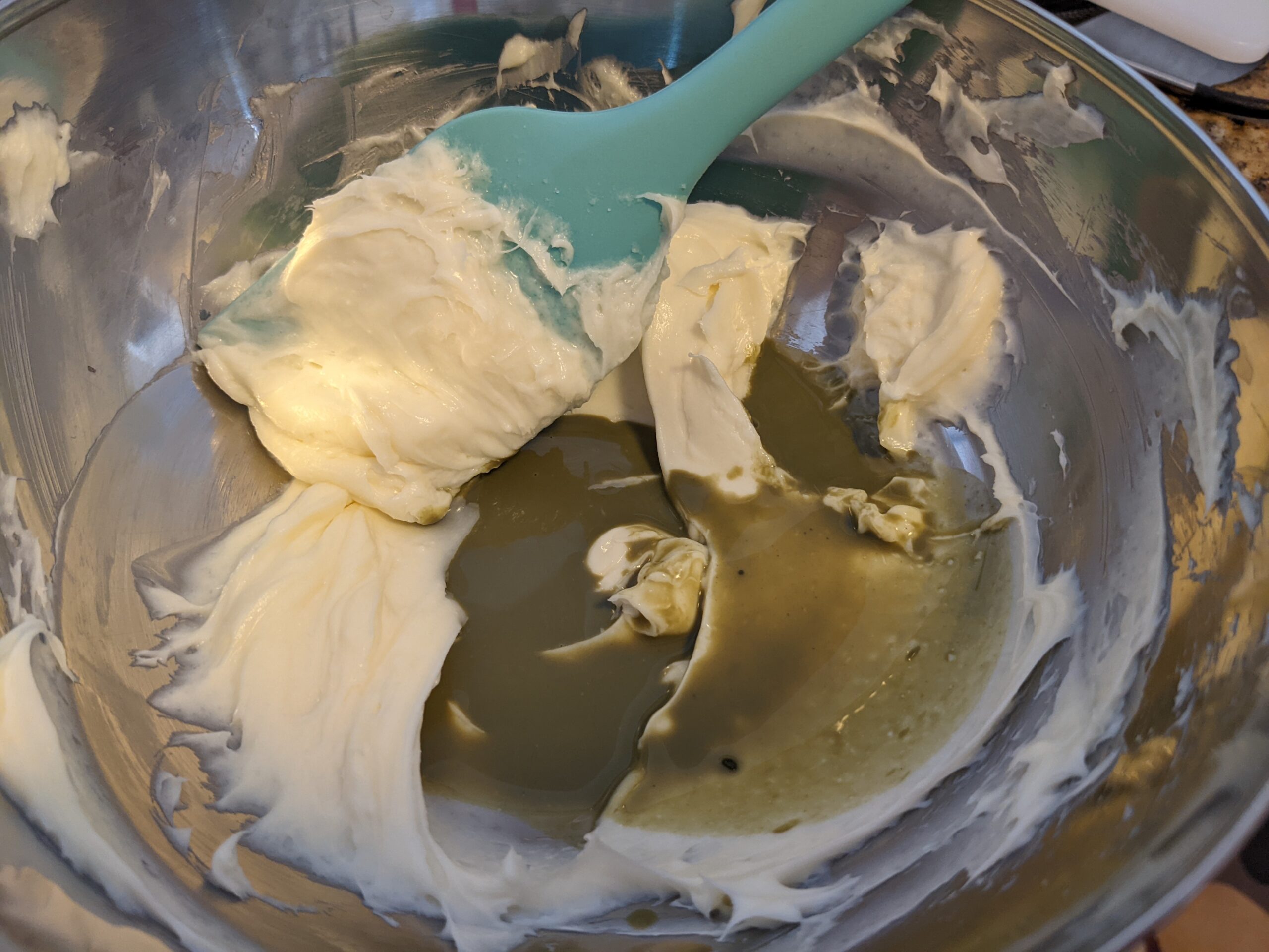 STEP 5: pour matcha gelatin mix into the cream cheese mix in a few different times for complete mixture