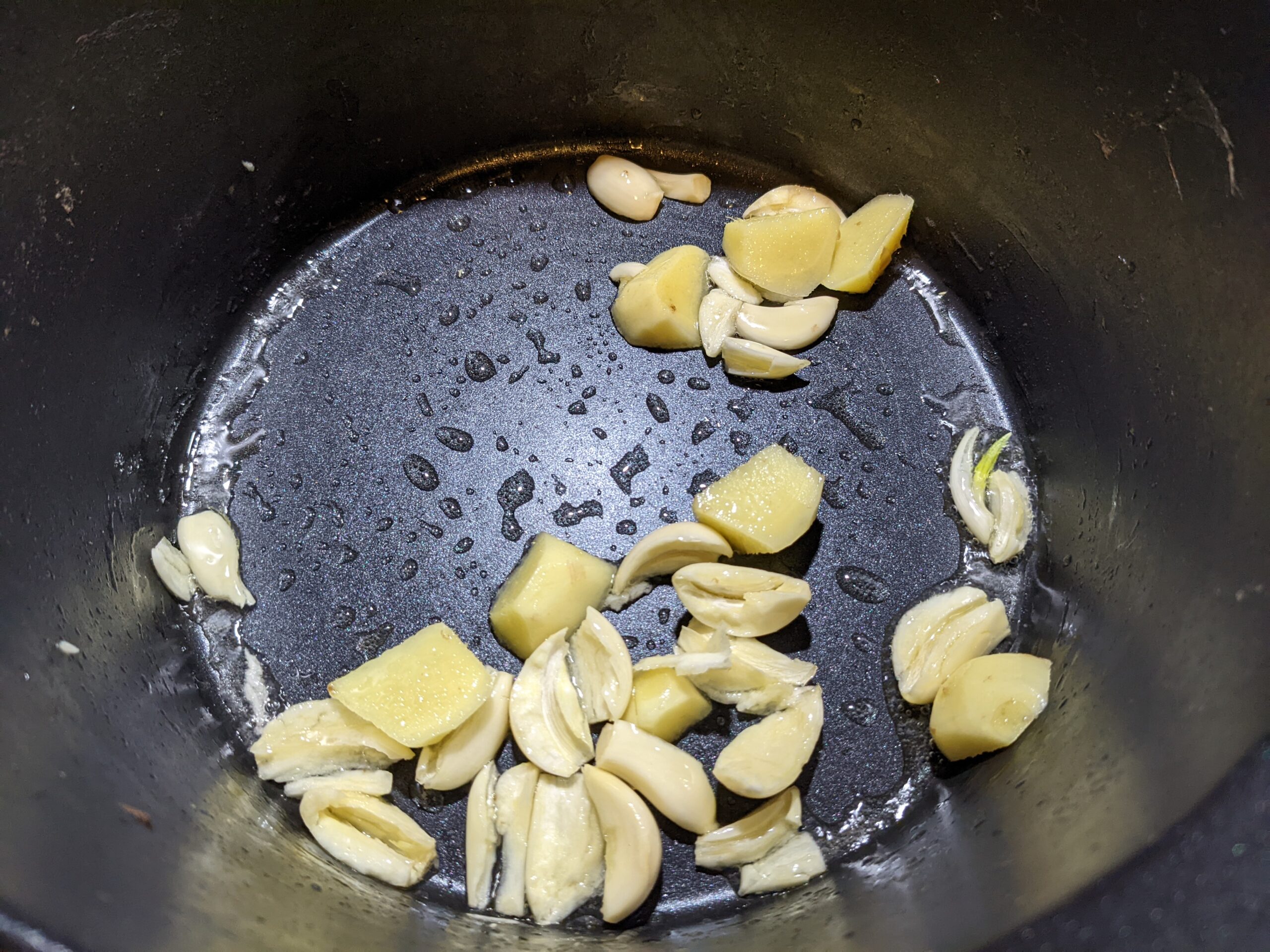 STEP 3: in a pot with oil, stir fry ginger and garlic cloves under medium heat