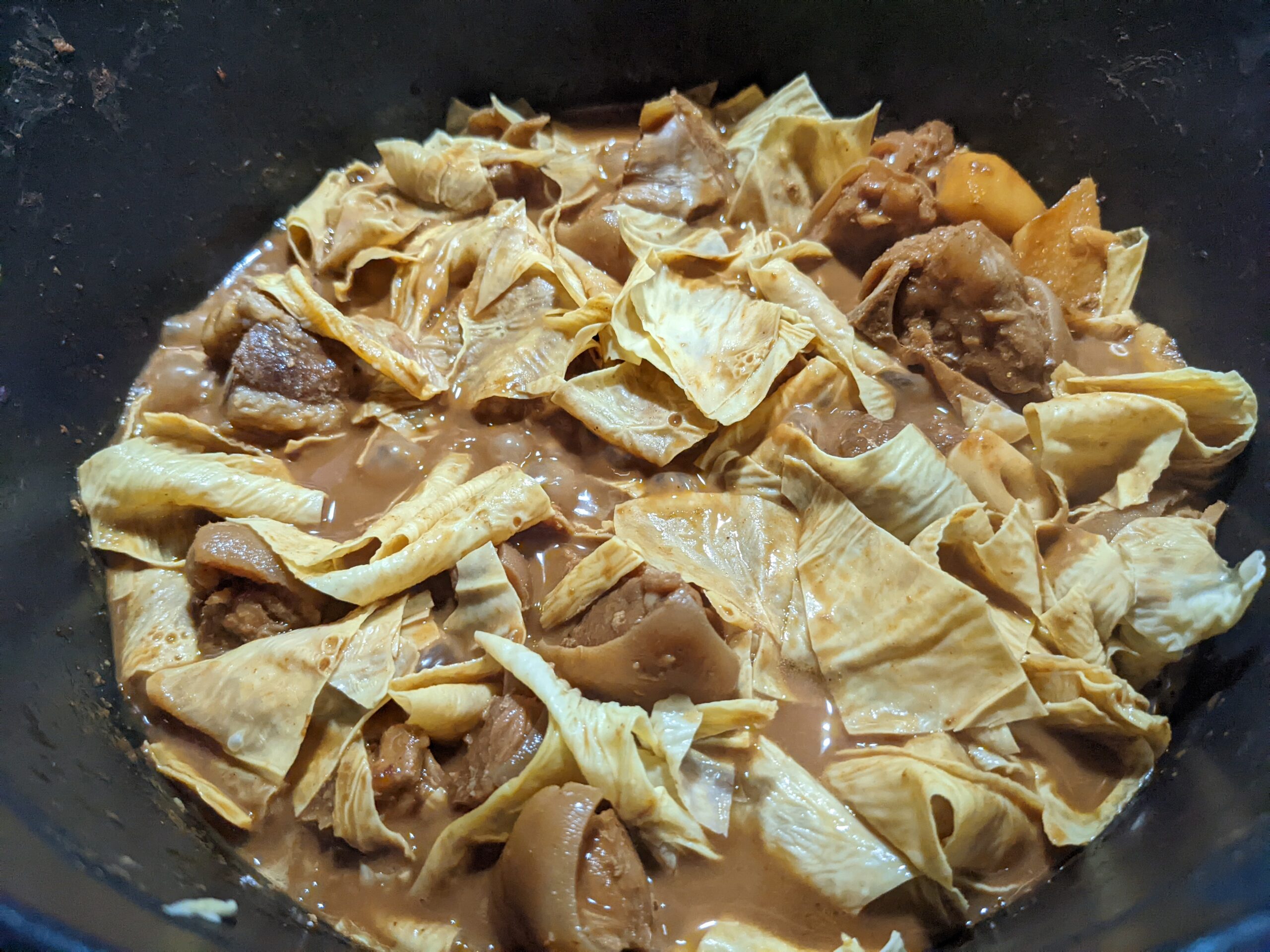 STEP 9: slice soften tofu skin to bite size, add them in the last 10mins of cooking