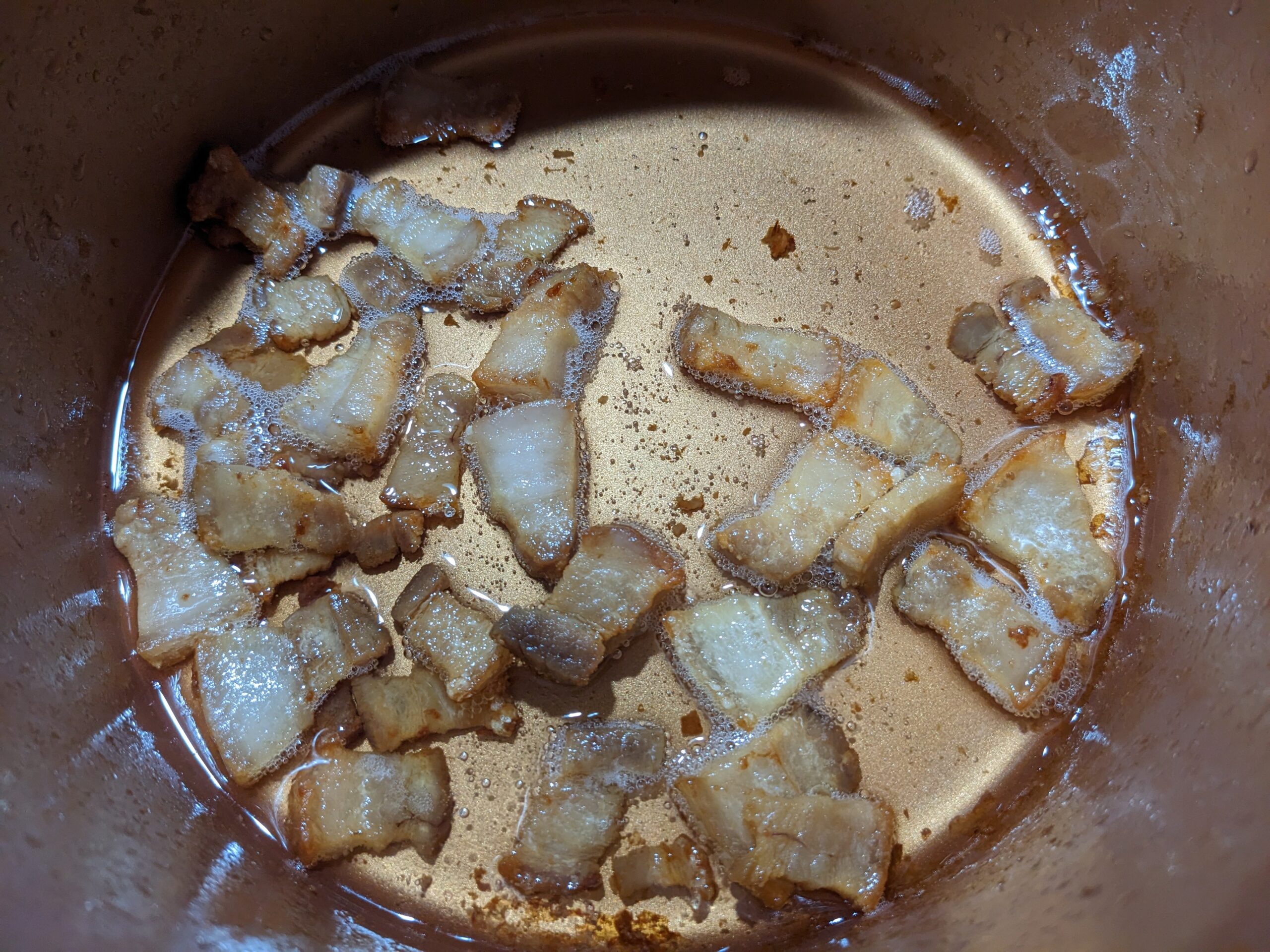STEP 4: Add in 1-2 tbsp sugar or 1-2 pieces of rock sugars to help get that caramelized coat on the pork belly. Keep stirring patiently. The pork will begin to fry in its own fat—watch out for splatters! Use a lid or splatter guard for safety. Once some pieces shrink to about half their original size and turn golden and crispy, remove them from the pot to prevent overcooking.