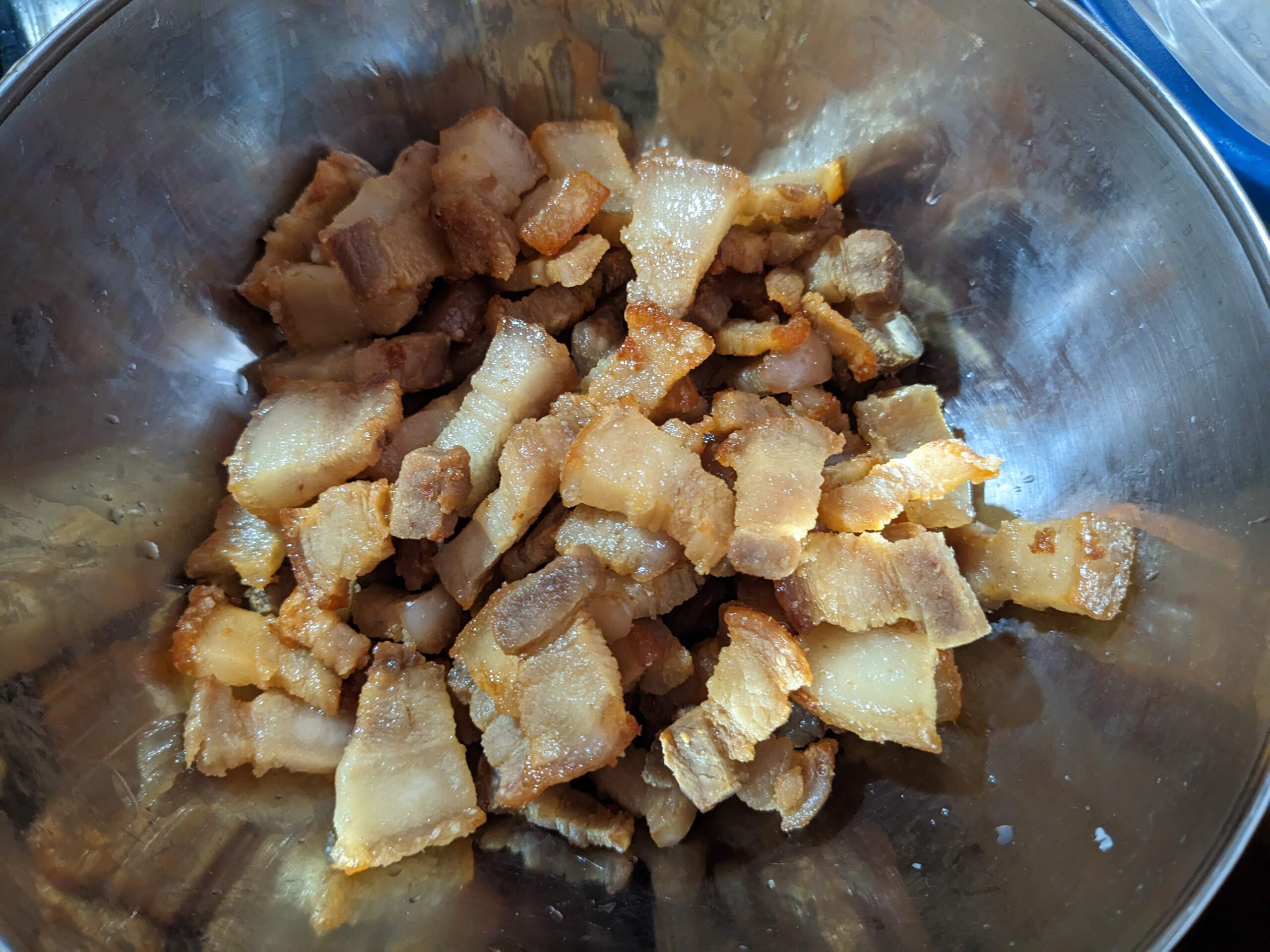 - Rendering the lard is the most hands-on step – cook it low to medium heat patiently till pork belly is golden; pork belly’s size shrinks a lot as lard is rendered