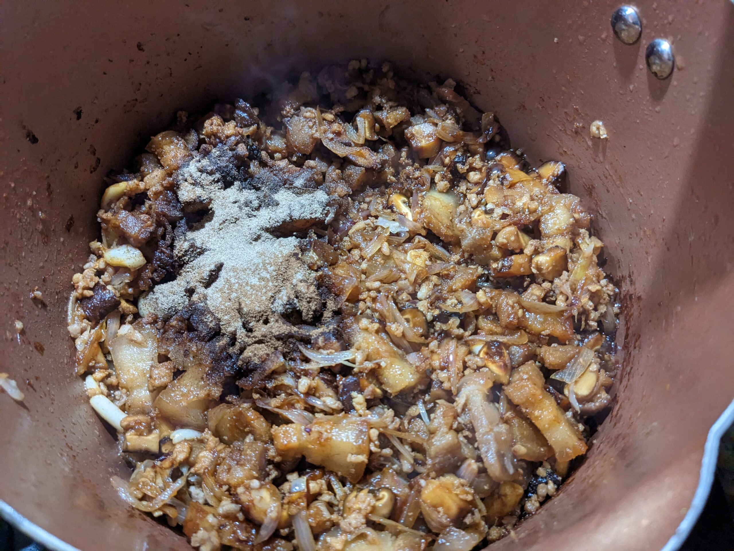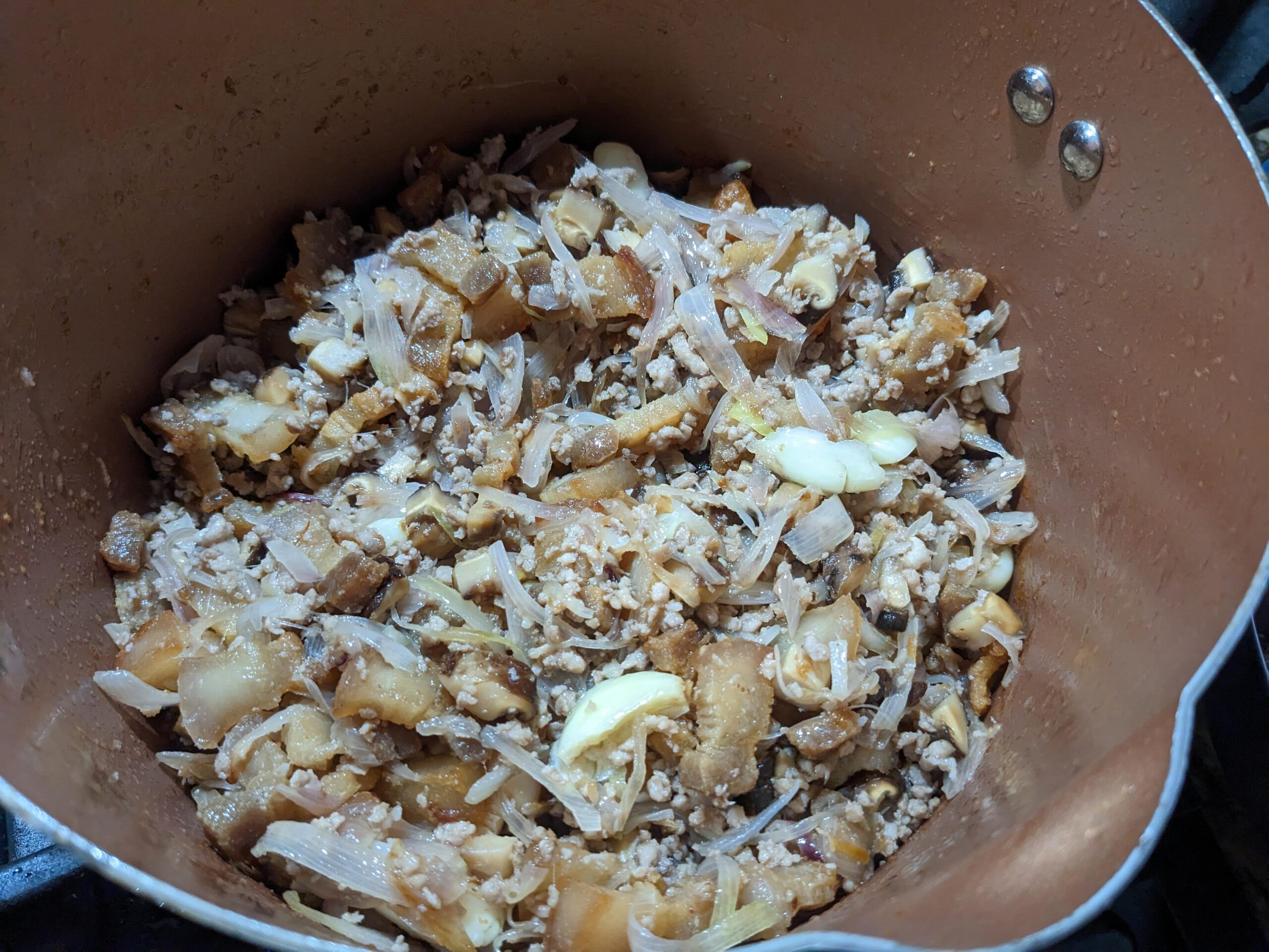 STEP 6: Sauté sliced shallots in the pork lard until golden and fragrant. Add a few cloves of smashed garlic and cook until the edges turn golden as well. Then, stir in the minced mushrooms and cook until they release their aroma and begin to brown