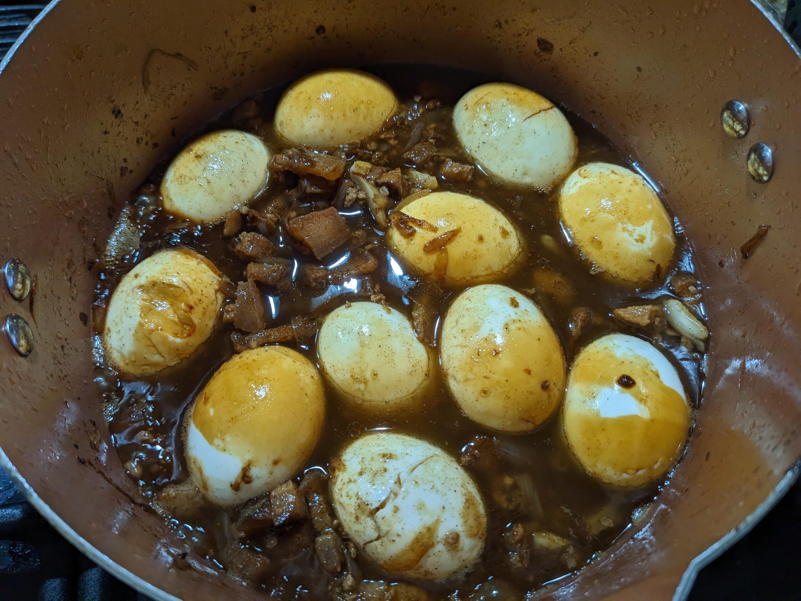 STEP 9: Add enough hot water to fully cover the meat. Bring to a boil, then reduce the heat to low-medium and simmer for 45 minutes to 1 hour. Add hard-boiled eggs during the last 20–30 minutes to let them absorb the flavor