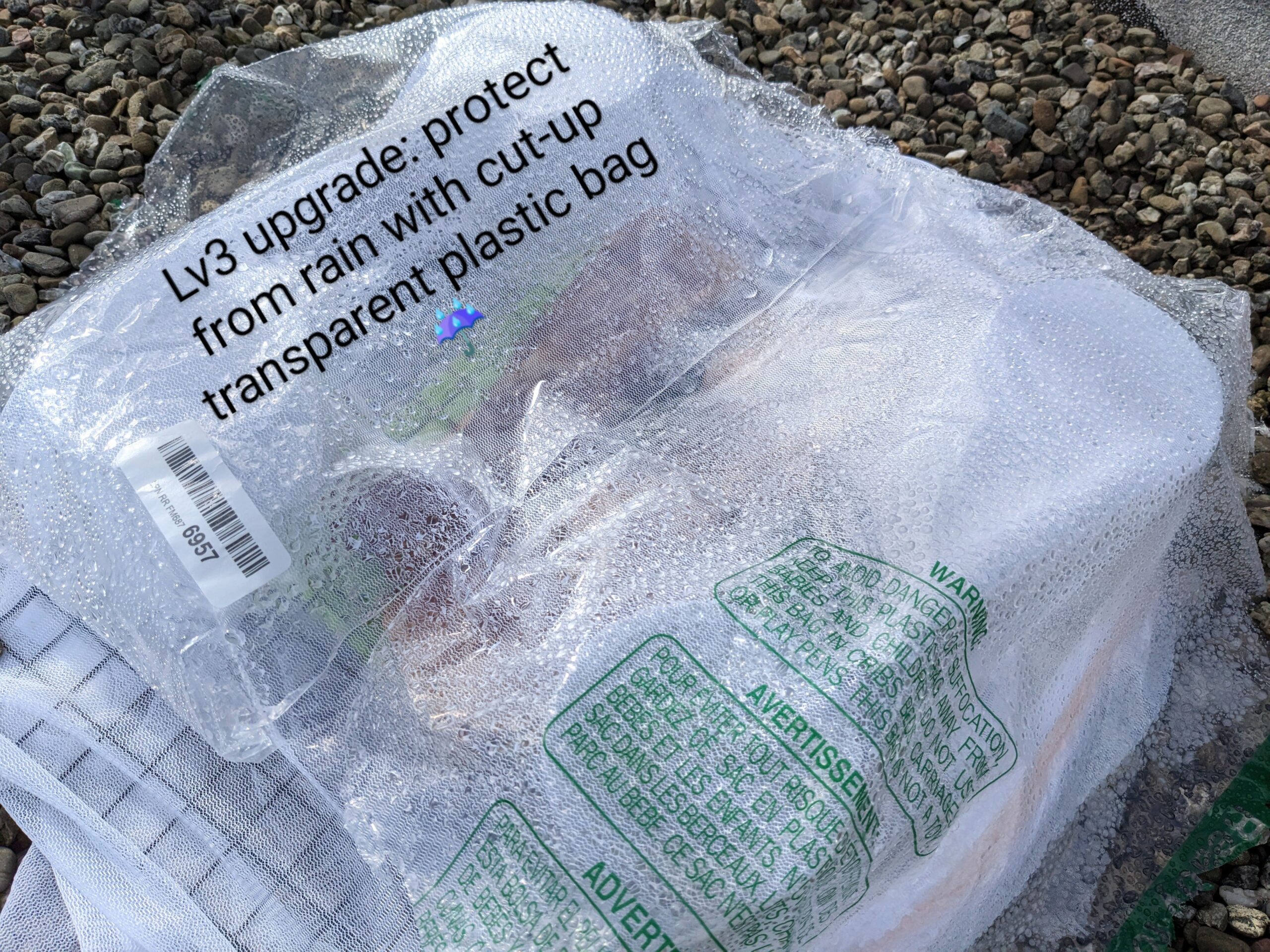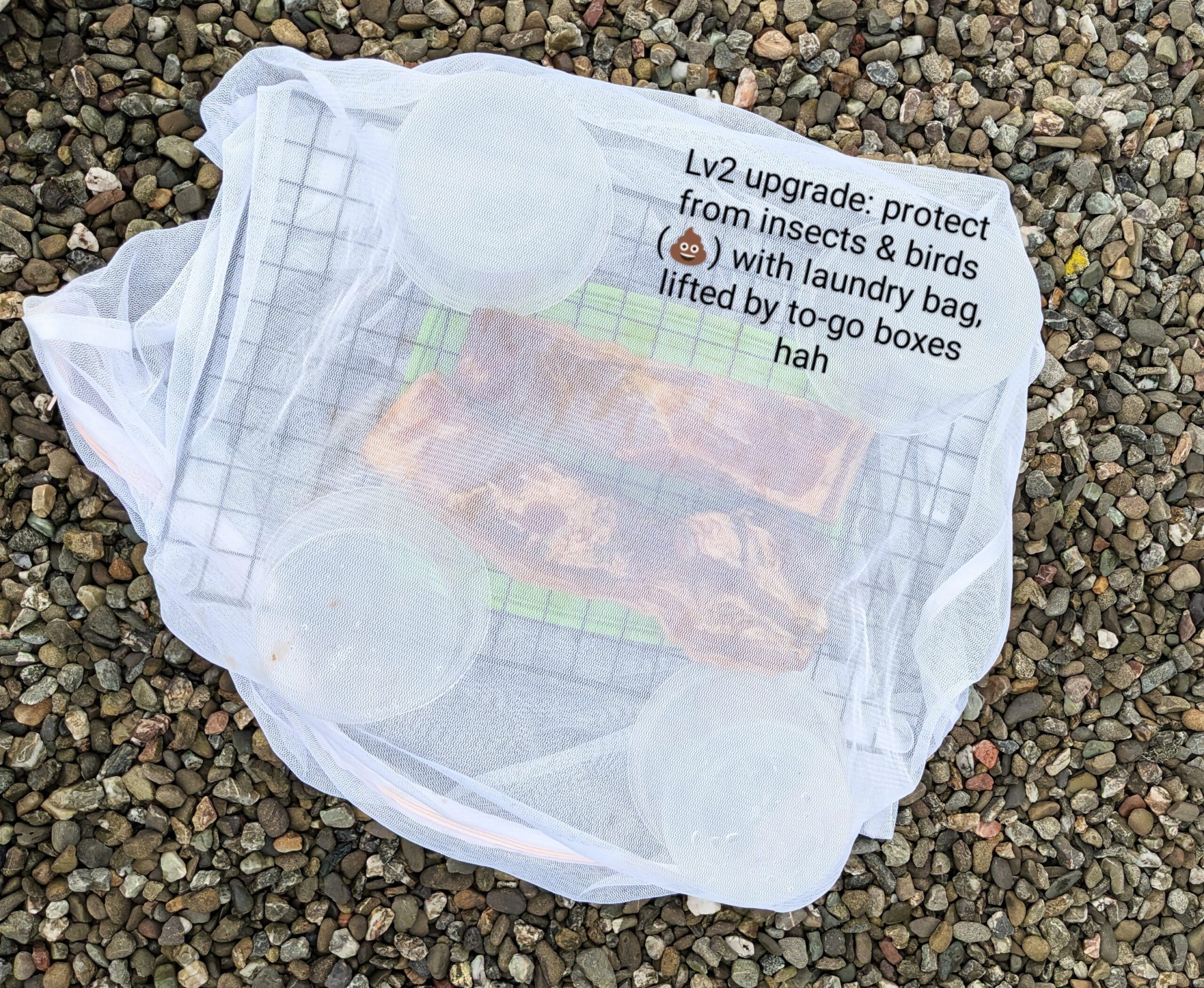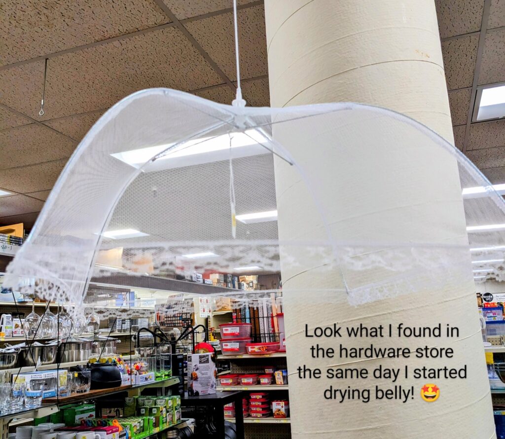 To protect my pork belly, I have been running up and down the rooftop the last full week. Upgraded my belly’s home a few times, to add a laundry bag as a protection from bugs and birds, to add a plastic bag as cover from rain (Bay Area sure has almost the whole year’s rain the past winter!), to add an actual “tent” so no cloth is touching the meat (I found it in a hardware store in Japan Town; it is the last one in the store and usually used to cover leftover food on dining table). What an interesting and “fruitful” journey to dry my pork belly!