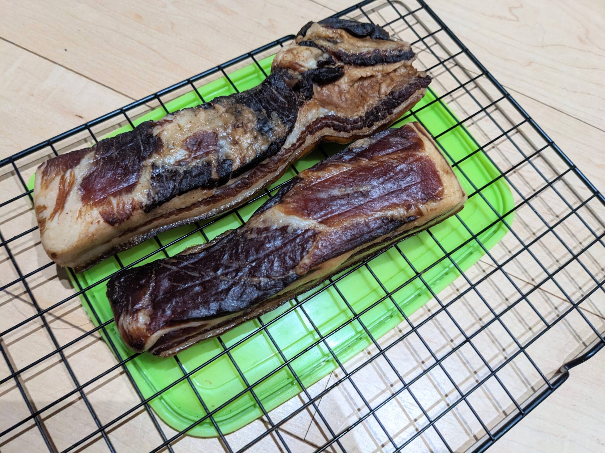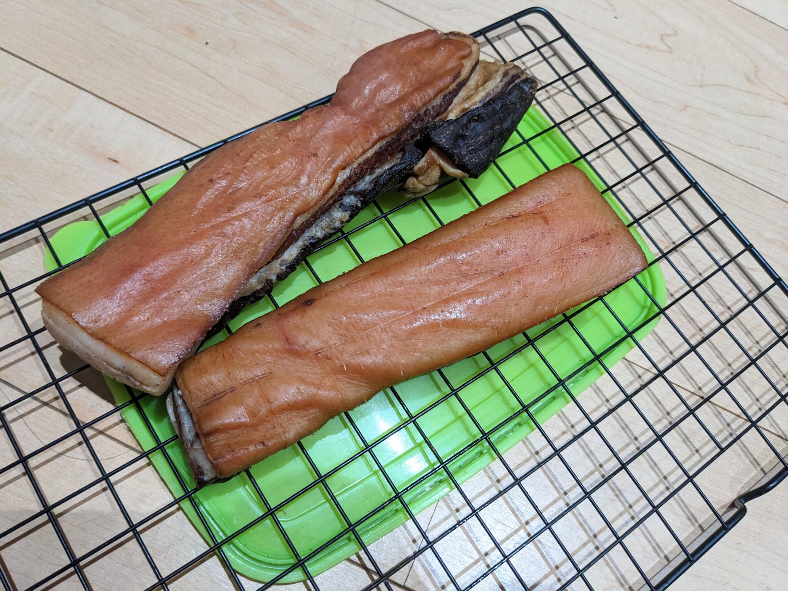 Different areas in China dry pork belly differently, but we have one thing in common — always dry pork belly, sausage, wings, other meat in the cold and dry winter and enjoy them during and shortly after Chinese New Year. Cantonese dried pork belly is so versatile and can be used in many dishes like Clay Pot rice, stir fry veggies, etc. When mom dries pork belly back home on top of her balcony, I was really jealous as I do not have a rooftop, even I have all the Cali sunshine mom is jealous of. I decided to sneak up my apartment rooftop and dry just 2 slices of pork belly. Let’s see how they turn out!