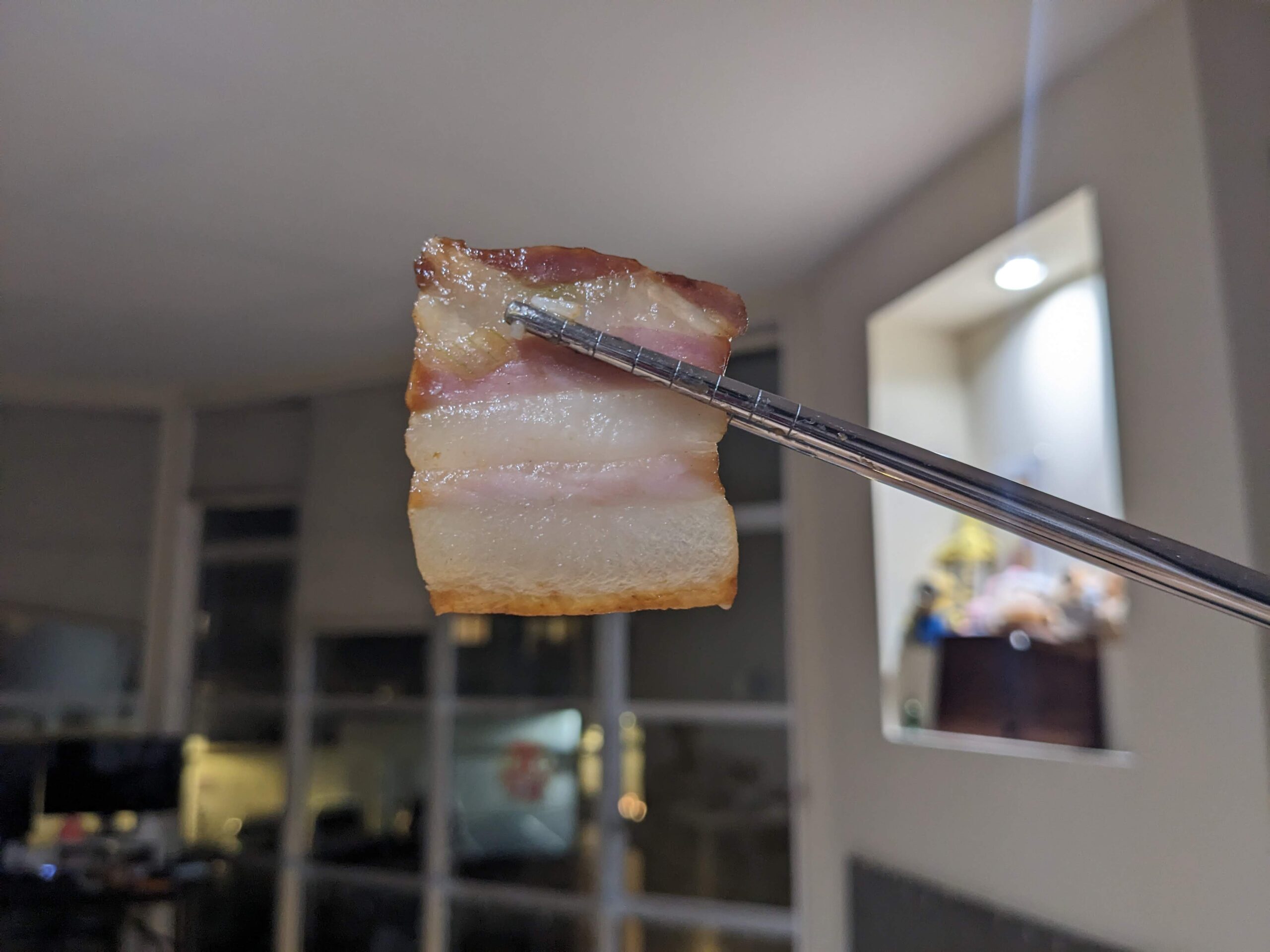 - if humidity increases at night, move pork belly indoor, do not need to store in fridge, RT will do