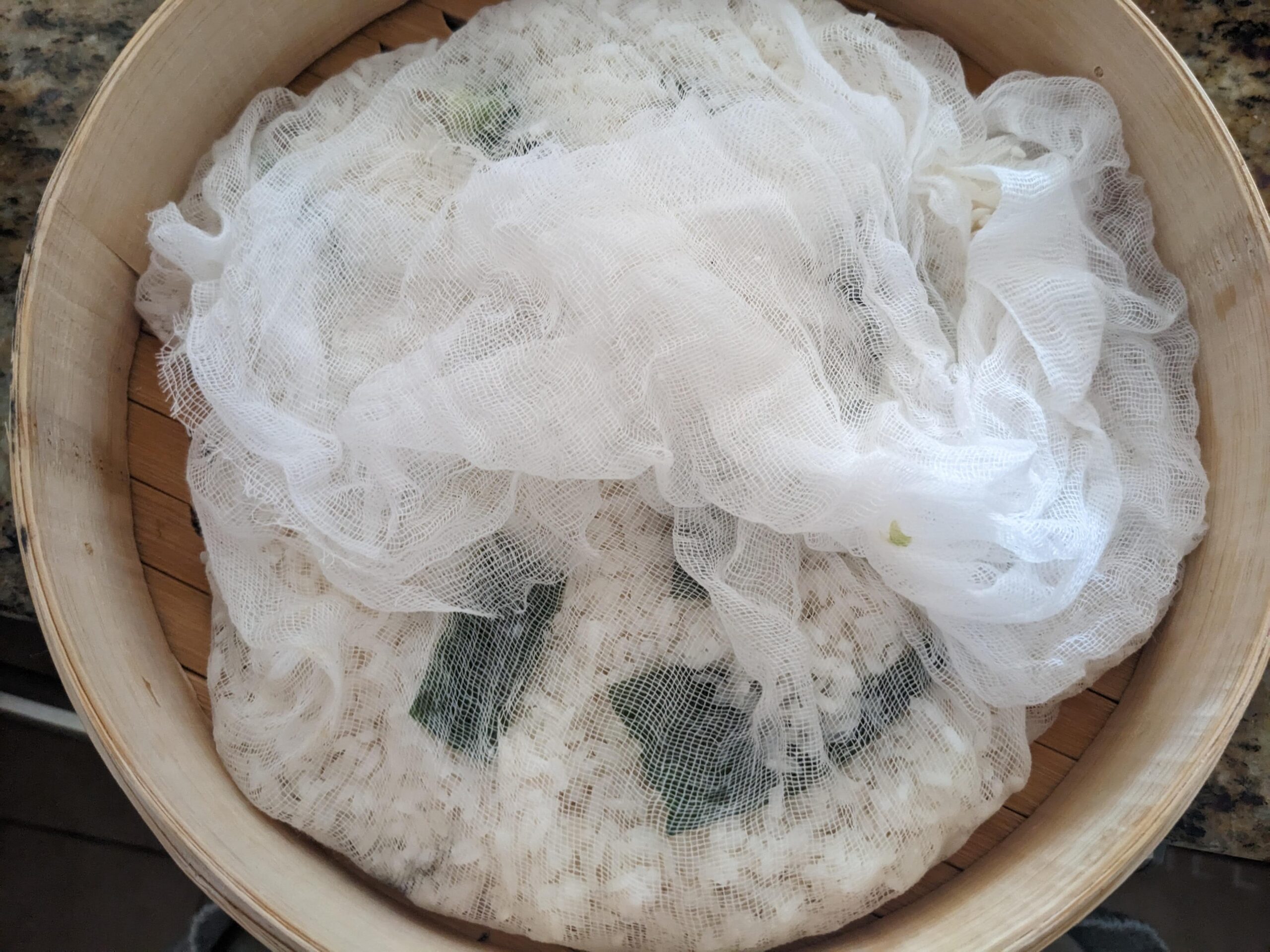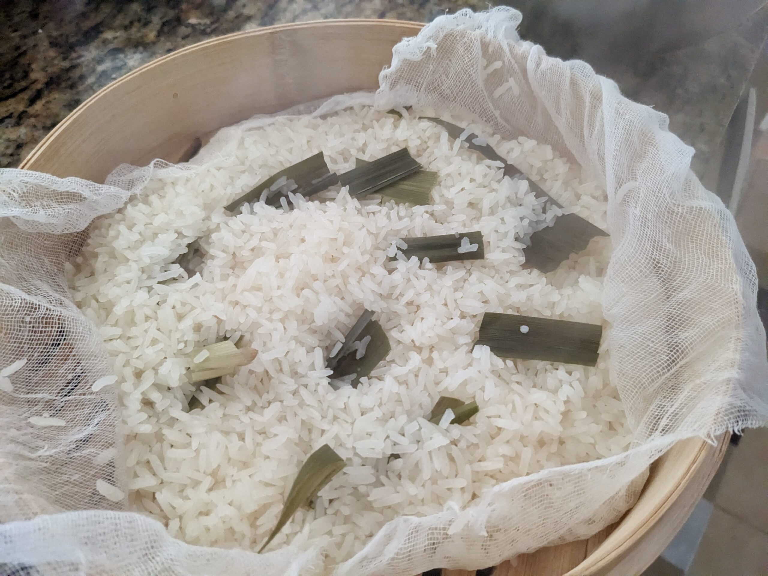 STEP 2: pour out water, and spread glutinous rice on a piece of (cheese) cloth evenly, transfer glutinous rice and cheese cloth on the steamer; make sure there is some space along the edge of steamer so steam can come up and cook the glutinous rice thoroughly. Add a few pieces of pandan leaves to add extra flavor. Fold cheese cloth over to cover glutinous rice