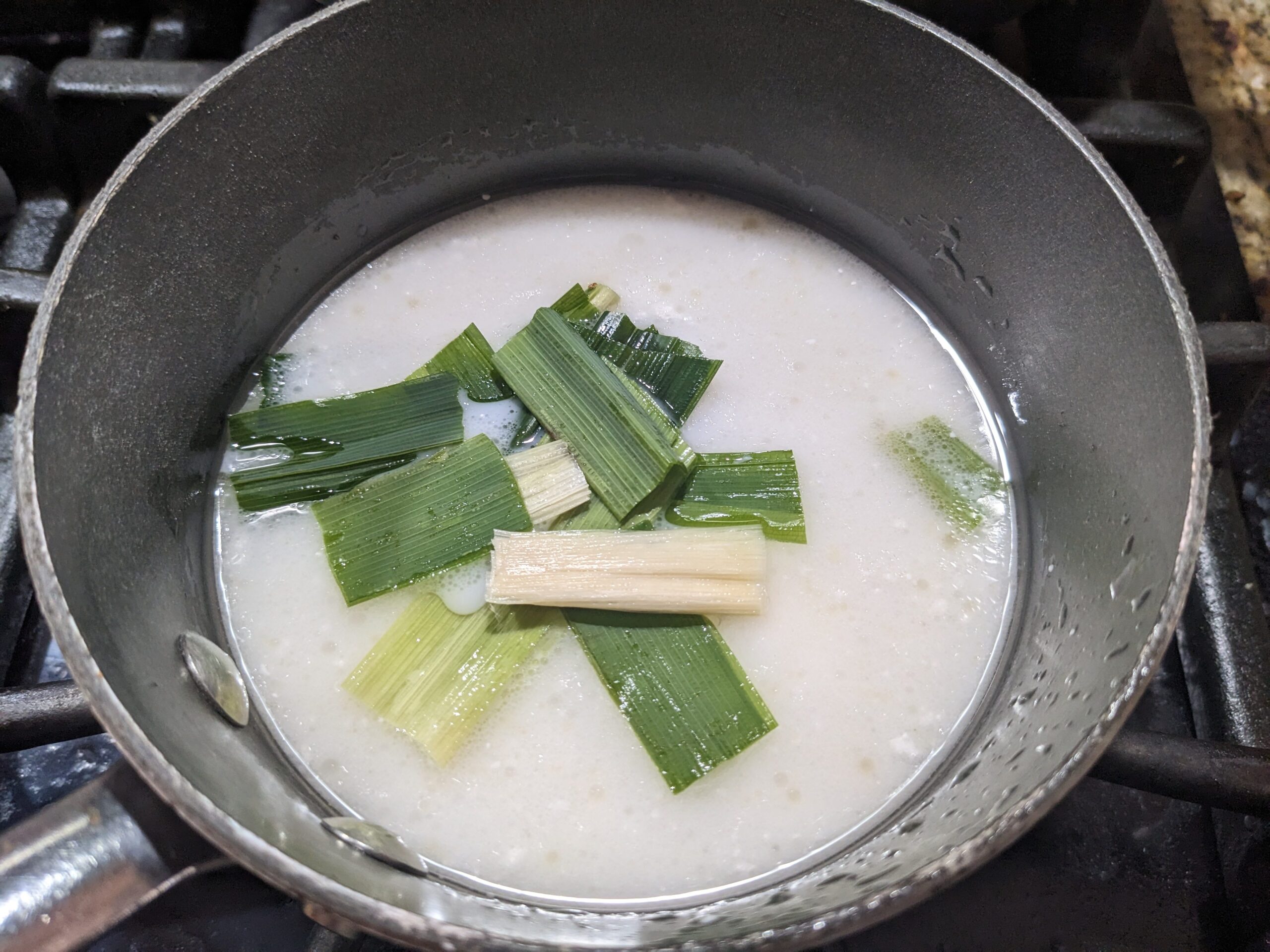 STEP 4: while glutinous rice is steaming, in a pot, add 280ml coconut milks, ~100-150g sugar (or monkfruit sweetener), 4-5g salt, a few pieces of pandan leaves; heat up till sugar dissolves, turn off heat and put the lid back on the maintain warm temperature