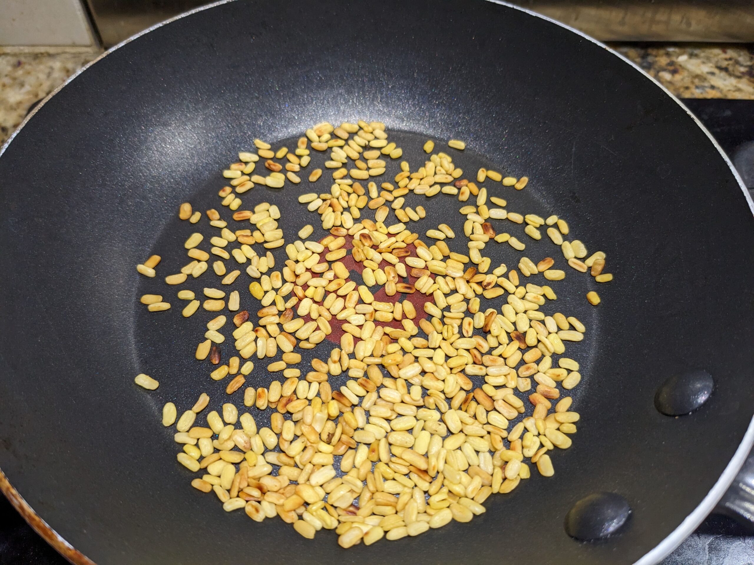 STEP 9: lightly grease a pan, over medium heat, gently toast green beans till golden and crispy, set aside to cool down; make sure green beans are not sitting on top of each other
