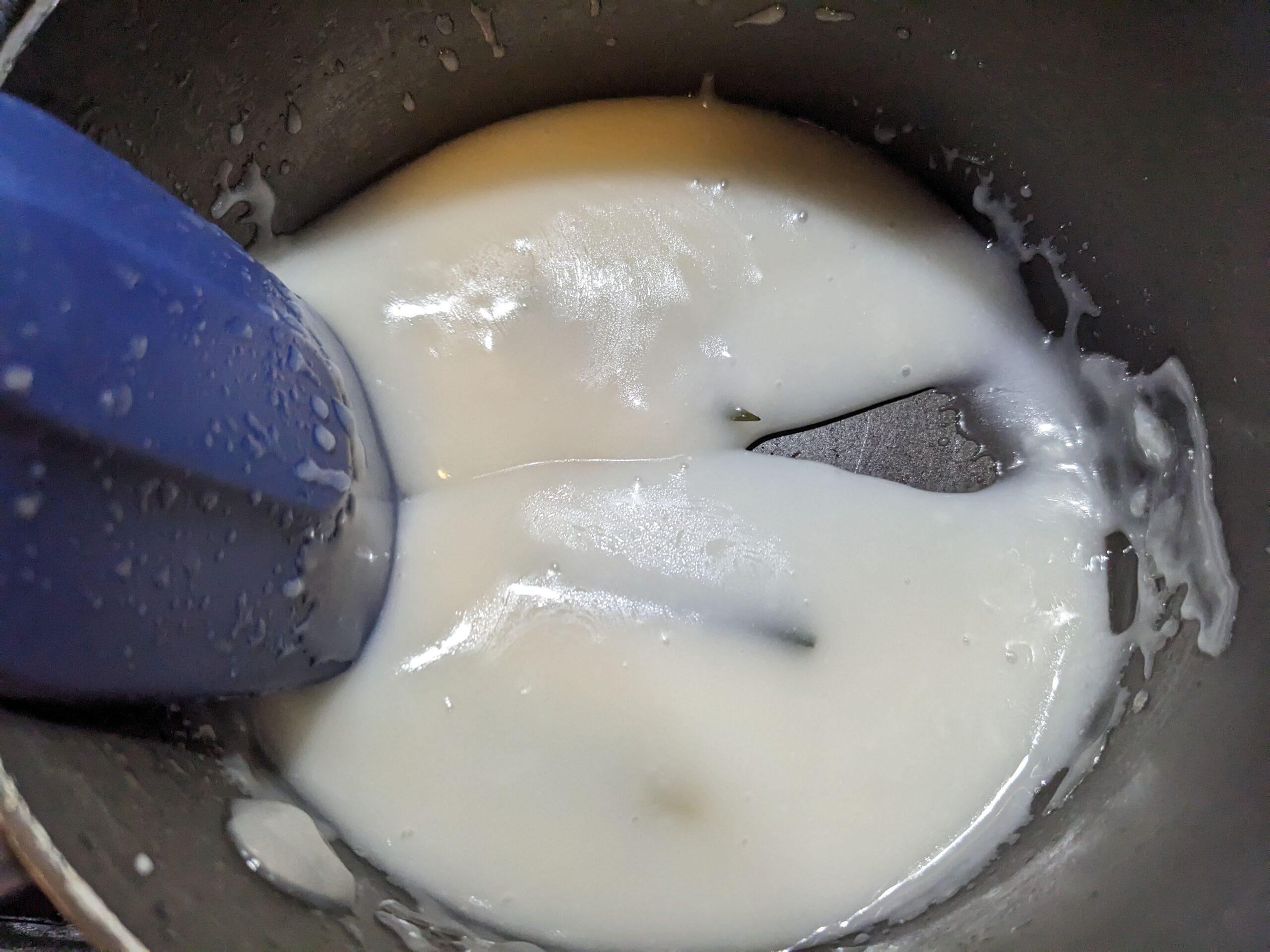 STEP 10: add a few tbsp of the remaining 120ml coconut milk to ~4.5g corn starch, mix corn starch till there is no lumps, pour coconut milk and corn starch mixture back to the 120ml coconut milk. Add ~10g sugar, 2g salt and a few pieces of pandan leaves