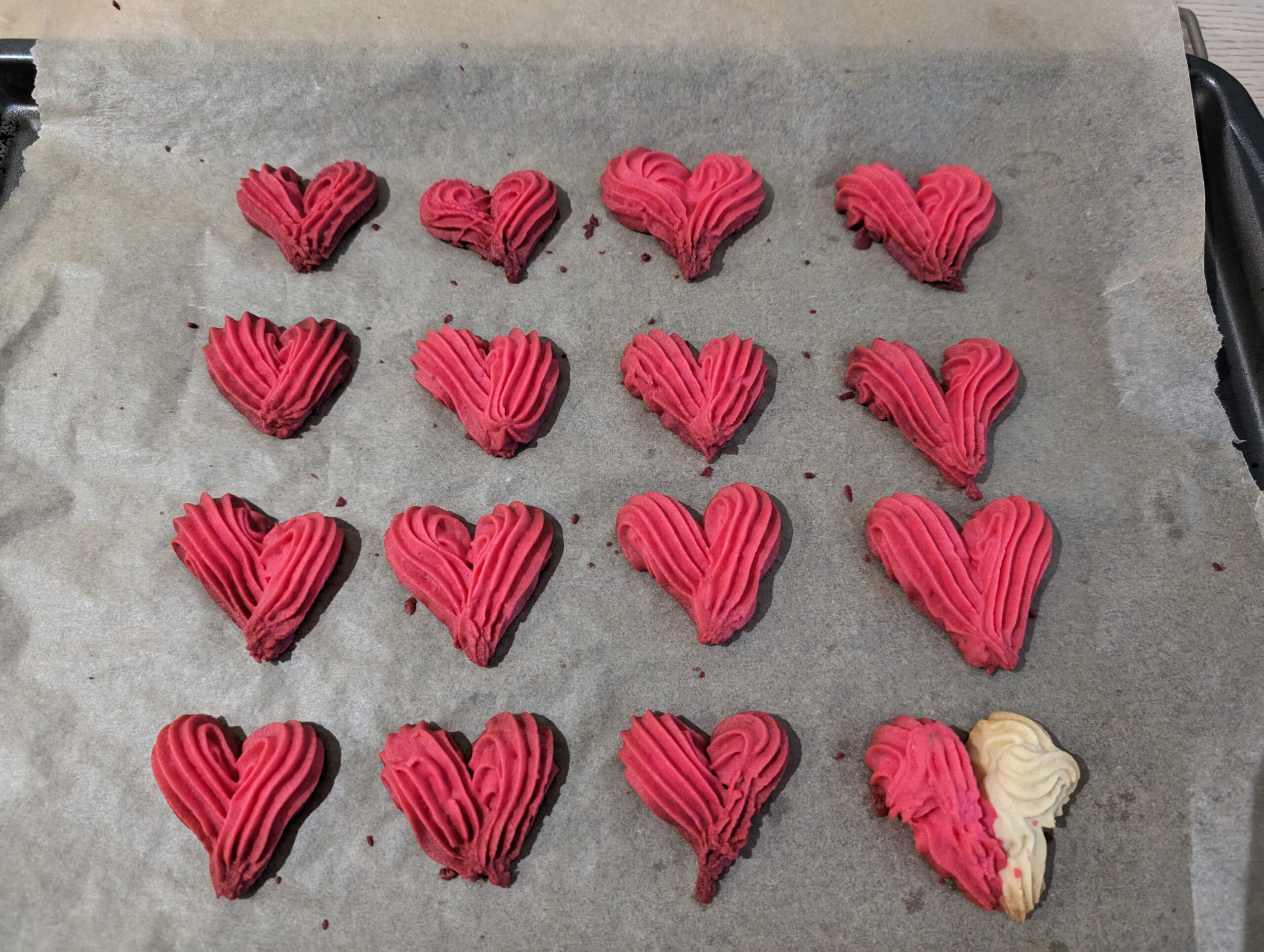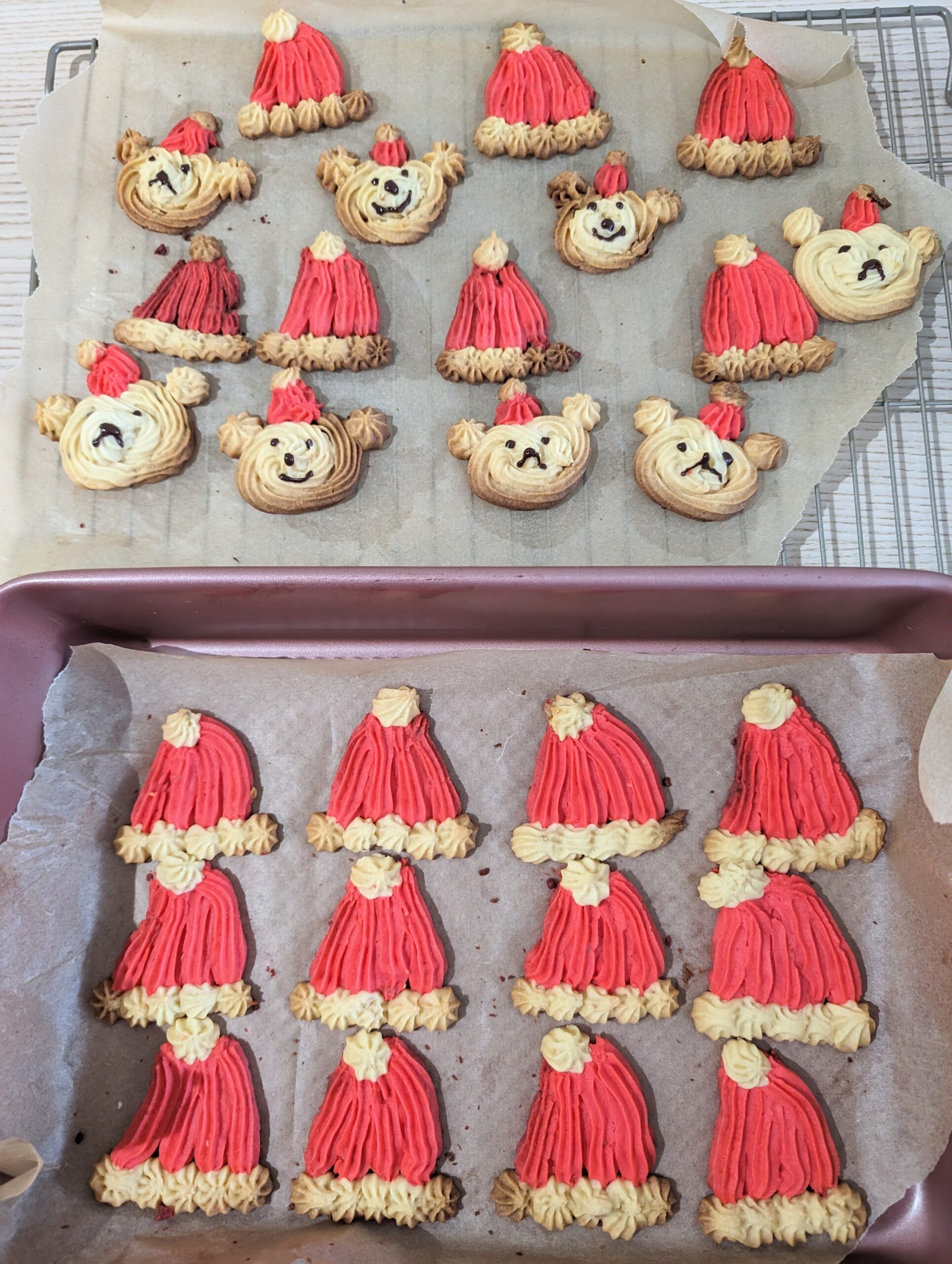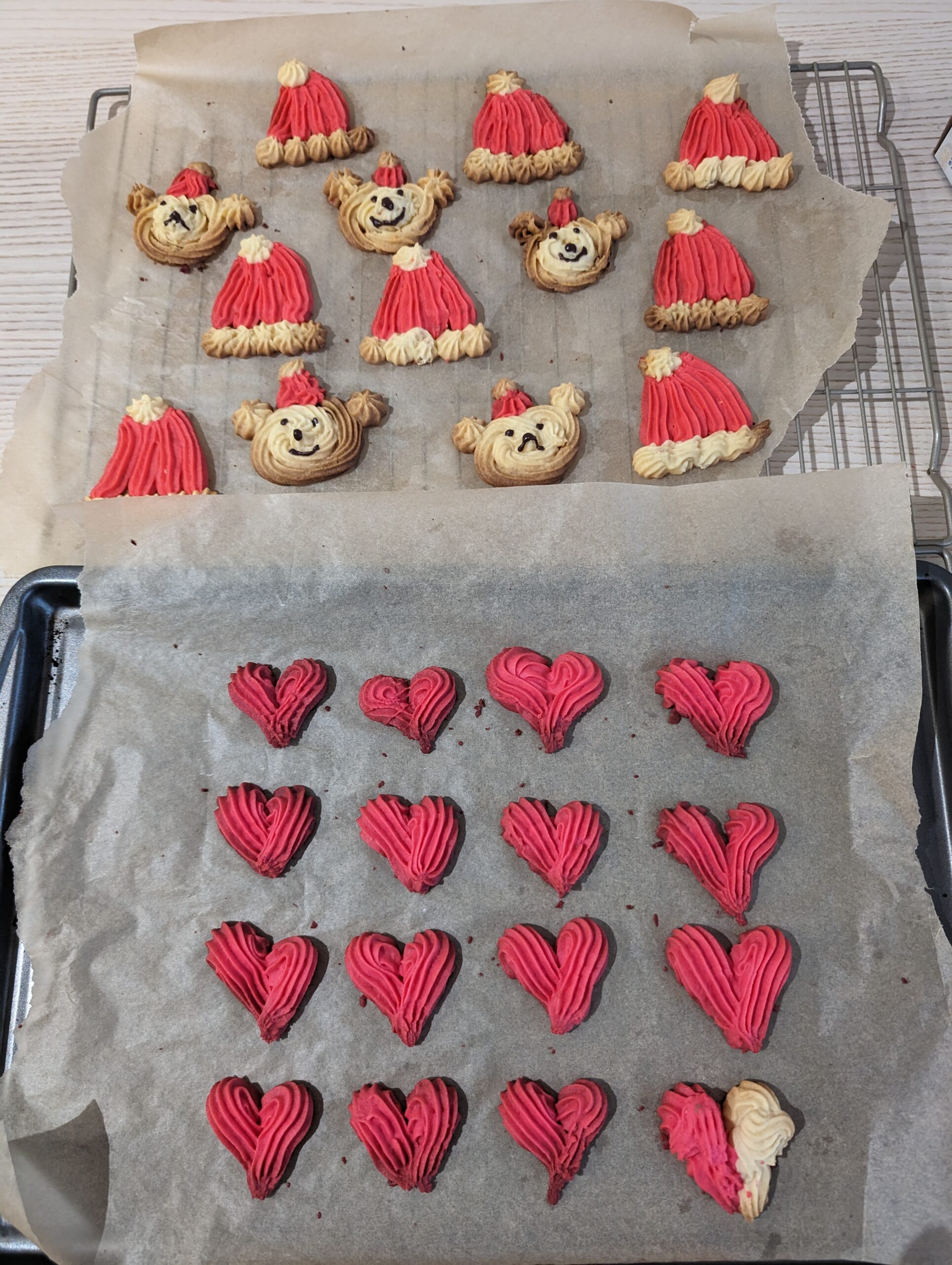 - if the cookie batter is too wet, put in fridge for a few days before piping; if too dry, transfer to piping bag and warm up with palms before piping