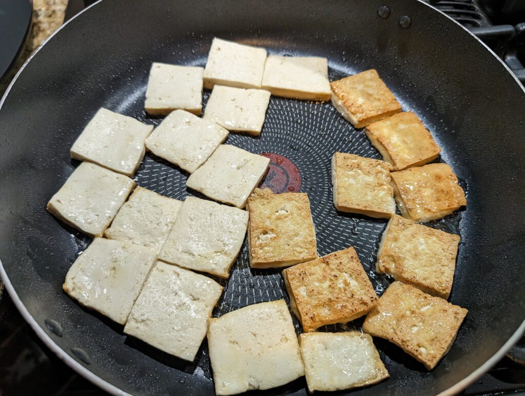 STEP 2: over oil and medium-high heat, pan fry tofu till both sides are crispy and golden. this step may take a while so be patient with it