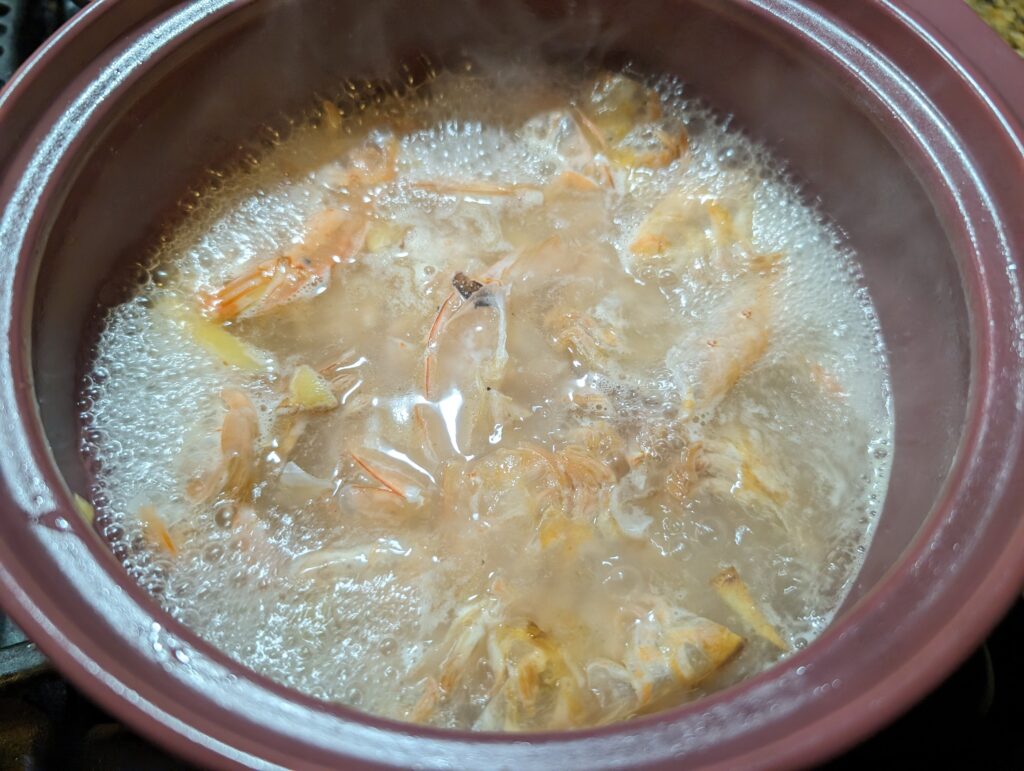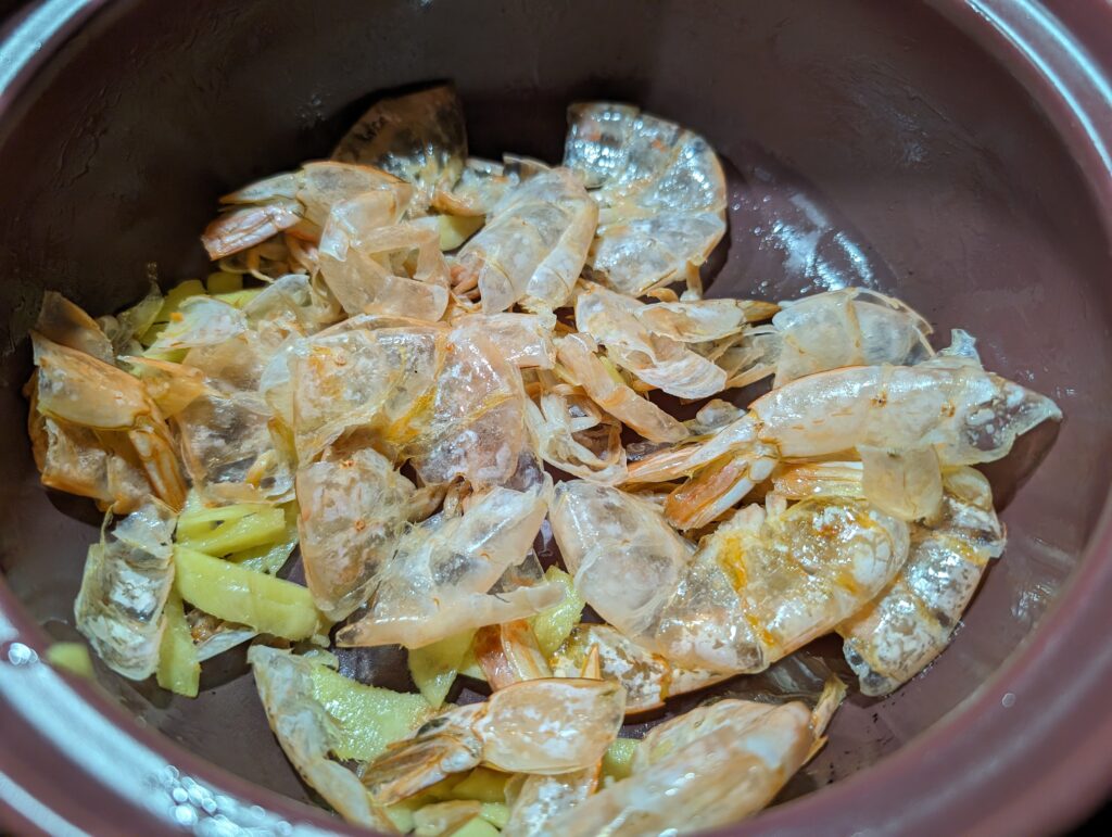 STEP 3: over oil and medium-high heat, stir fry garlic, ginger, shrimp heads and shells till the shrimp fat (red oil) is squeezed out. Pour over hot water and boil over high heat for 5-10mins for the broth with umami; sieve out soup base