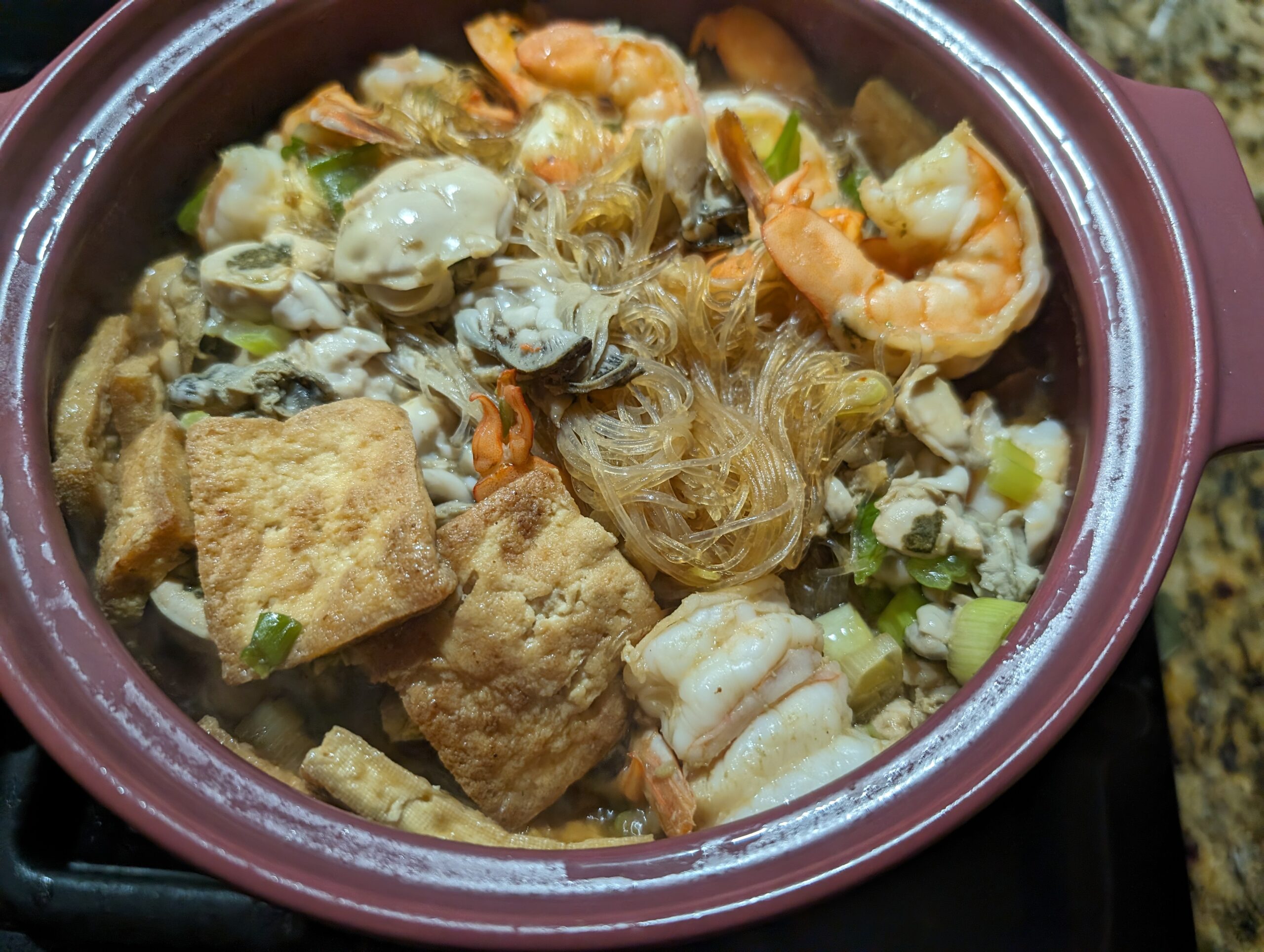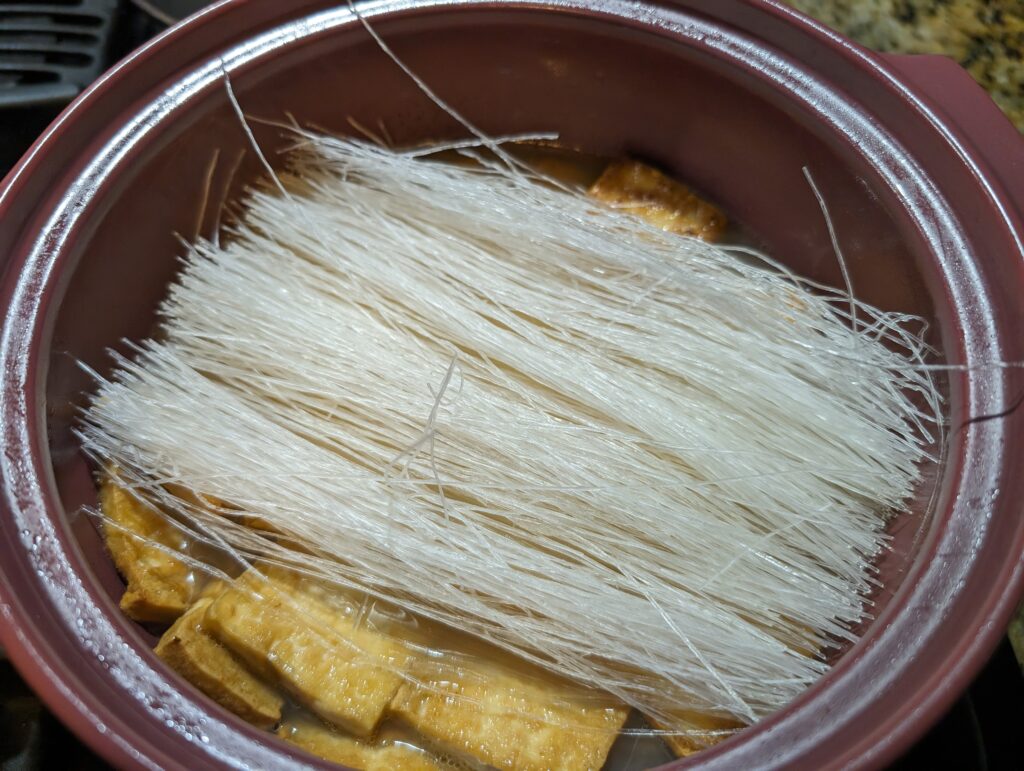 STEP 5: from bottom to top, layer crispy tofu, vermicelli, oyster, shrimp, pour over soup and the sauce over, cook in medium-high heat for 5-10mins, till the shrimps and oysters are cook
