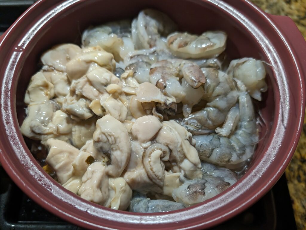STEP 1: wash oysters and shrimps; cut shrimp heads and peels shell off, set aside