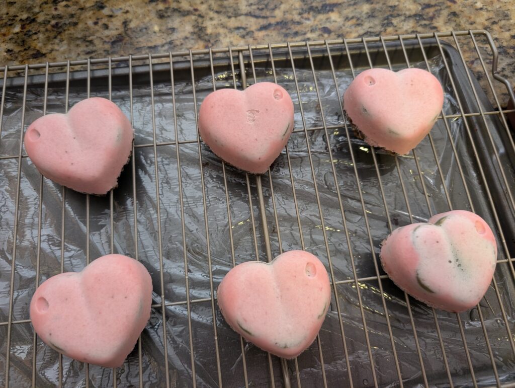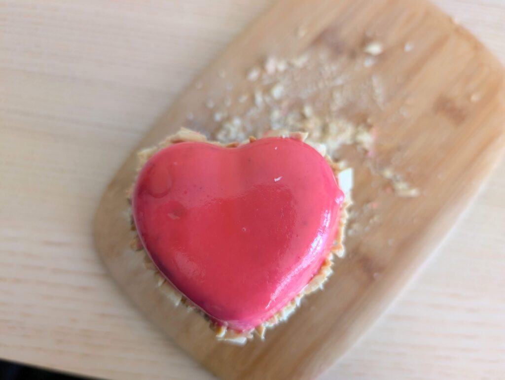 - gently de-mold the mousse, place on rack, pour the mirror glaze over mousse cakes
