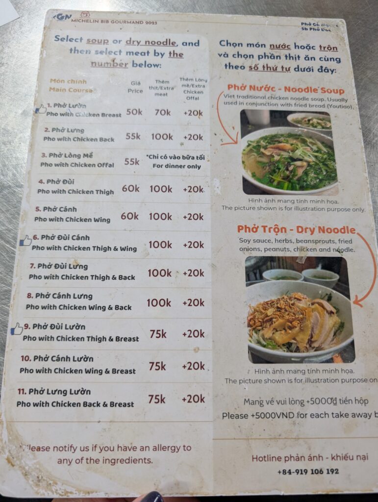 - Phở Gà Nguyệt (map) – has both dry (phở trộn) and soupy (phở nước) pho, and can select different chicken cuts. I think chicken wing is the best (60k dong or $2.4)!