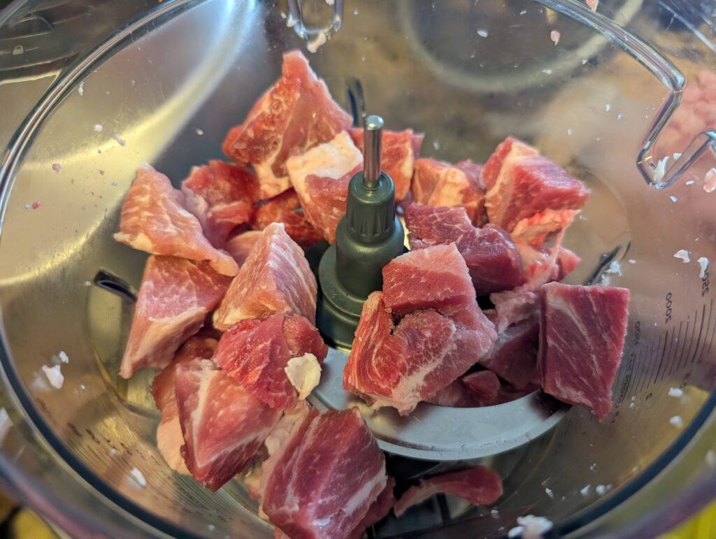 - Step 1: Thaw the pork for 1–2 hours. When it’s still partially frozen but slightly soft on the outside, separate the lean meat from the fatty part and cut both into ~4-5cm chunks. Keeping the meat cold helps achieve a springy, elastic texture and emulsify faster.